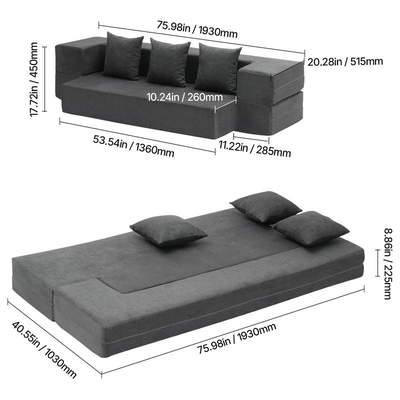• High-Resilience Support Foam: Made with premium foam materials, this folding sofa bed offers a soft yet supportive texture that rebounds quickly and resists deformation. Whether you're sitting or lying down for extended periods, it provides consistent support for all-day comfort.