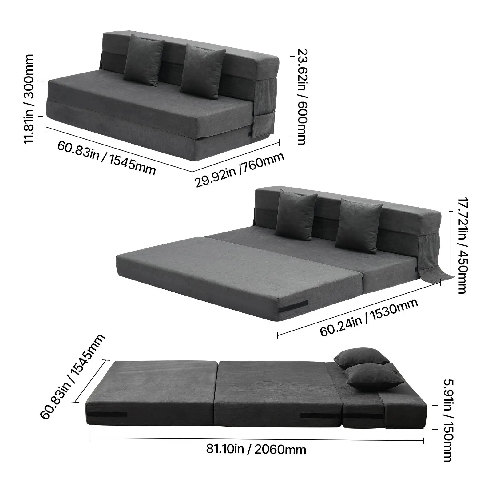 • High-Resilience Support Foam: Made with premium foam materials, this folding sofa bed offers a soft yet supportive texture that rebounds quickly and resists deformation. Whether you're sitting or lying down for extended periods, it provides consistent support for all-day comfort.