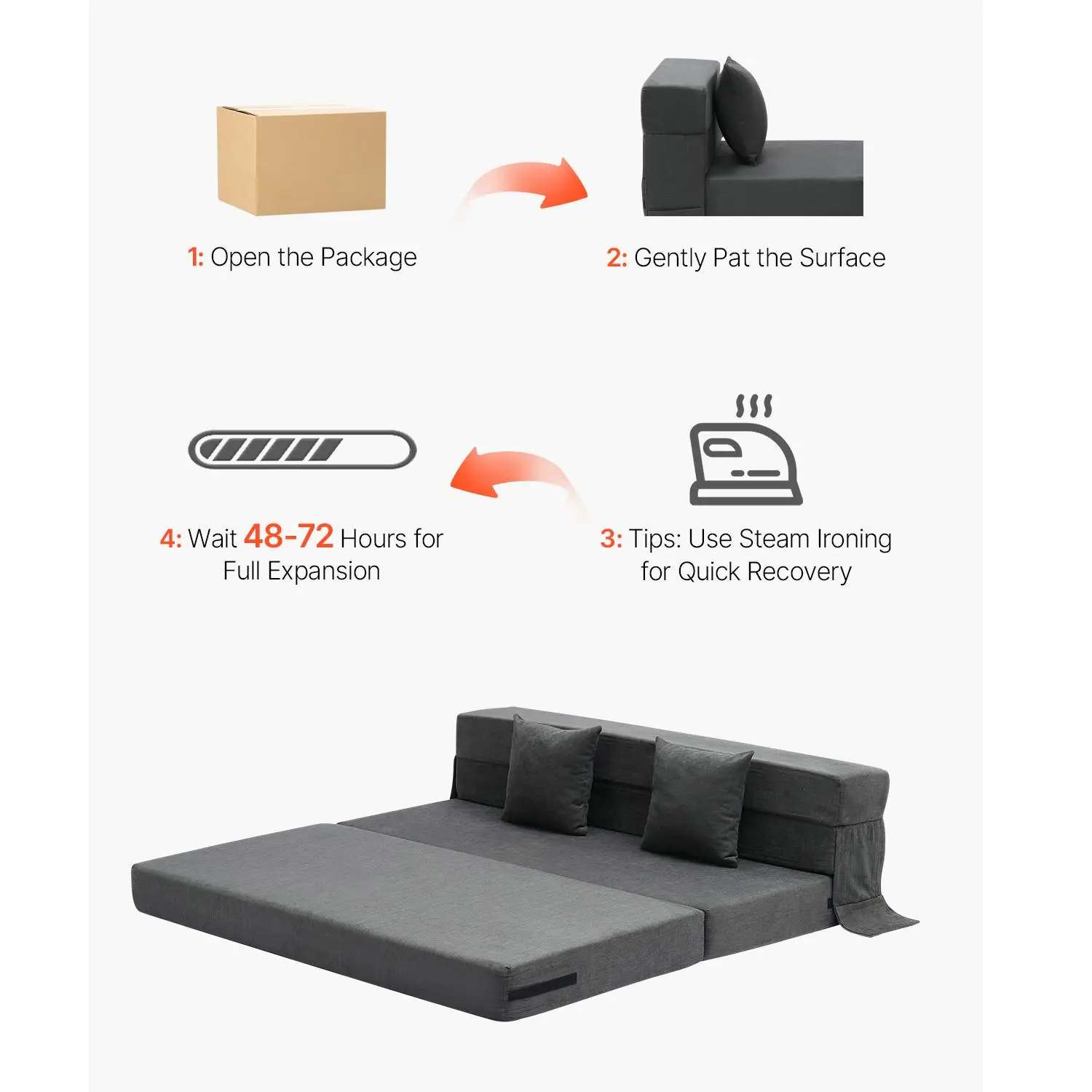 • Easy Folding: No complicated assembly needed—simply unfold it for use. When you're done, it easily folds up into a compact size for storage. This folding bed chair is designed to transition effortlessly between a sofa and a cushion, saving you time and space.