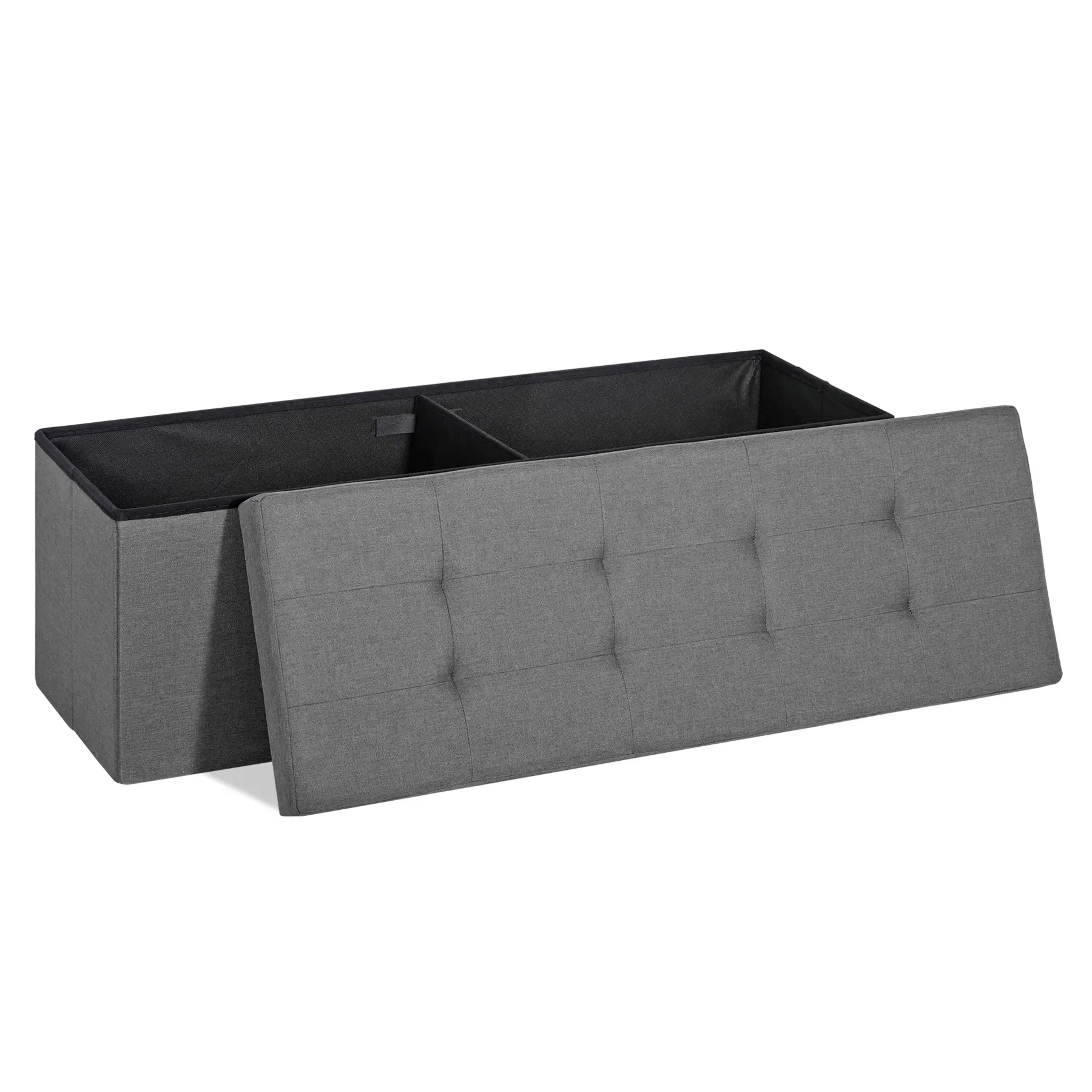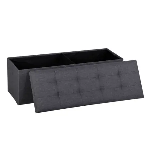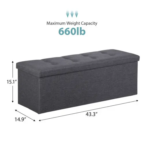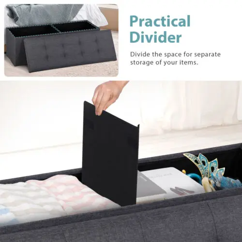 ZenStyle versatile storage bench has a 660-lb capacity and features a sturdy MDF frame, plush linen-covered upholstery, and a soft, breathable seat for ultimate comfort. Store toys, blankets, or magazines in its 120-liter hidden compartment with a wooden divider. It collapses in seconds, folds flat for compact storage, and easily converts into a footrest, coffee table, or cozy seat. With its classic dark gray design, this multi-functional ottoman adds chic to any bedroom, living room, or den. Declutter with style-comfort meets practicality!