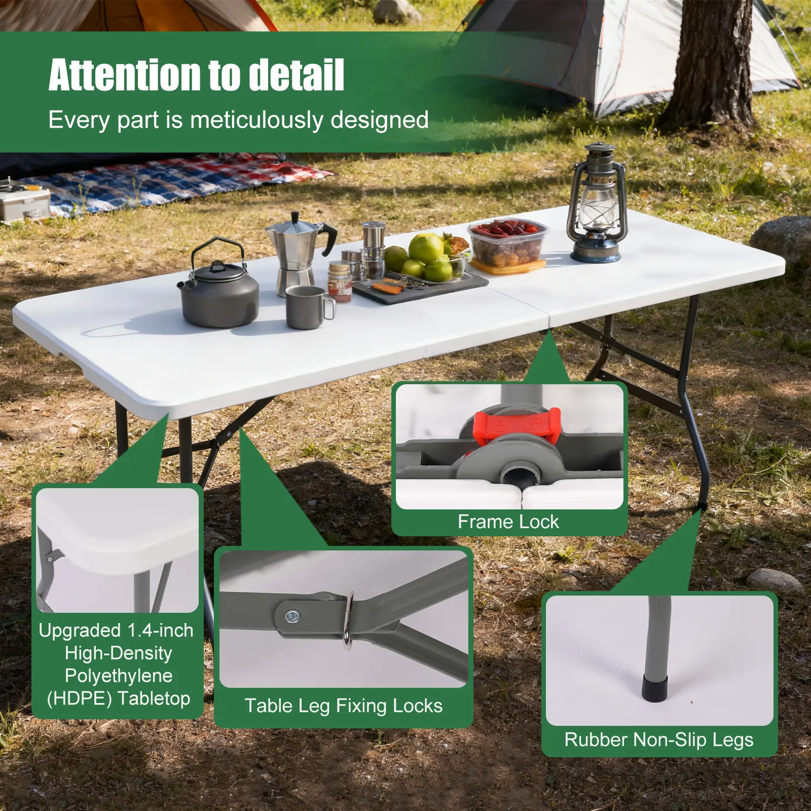 ·EASY ASSEMBLY: This 6ft camping table is ready for use right out of the box; simply unfold it, lock the legs to keep it sturdy, and your table is ready! DIMENSIONS: 71"L * 28"D * 29"H
