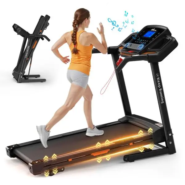 ·SPACE SAVING & HOLDER - The hydraulic lever allows fold the folding treadmill in a breeze (folding size: 27.4 * 28.3 * 46.3inches). which is convenient to store and space-saving. The space saver treadmill equipped with transport wheels, so you can move it to any place you want to exercise easily. The treadmill for apartment is also equipped with 2 cup holders and 1 pad holder to help you stay hydrated during / enrich your exercise time.