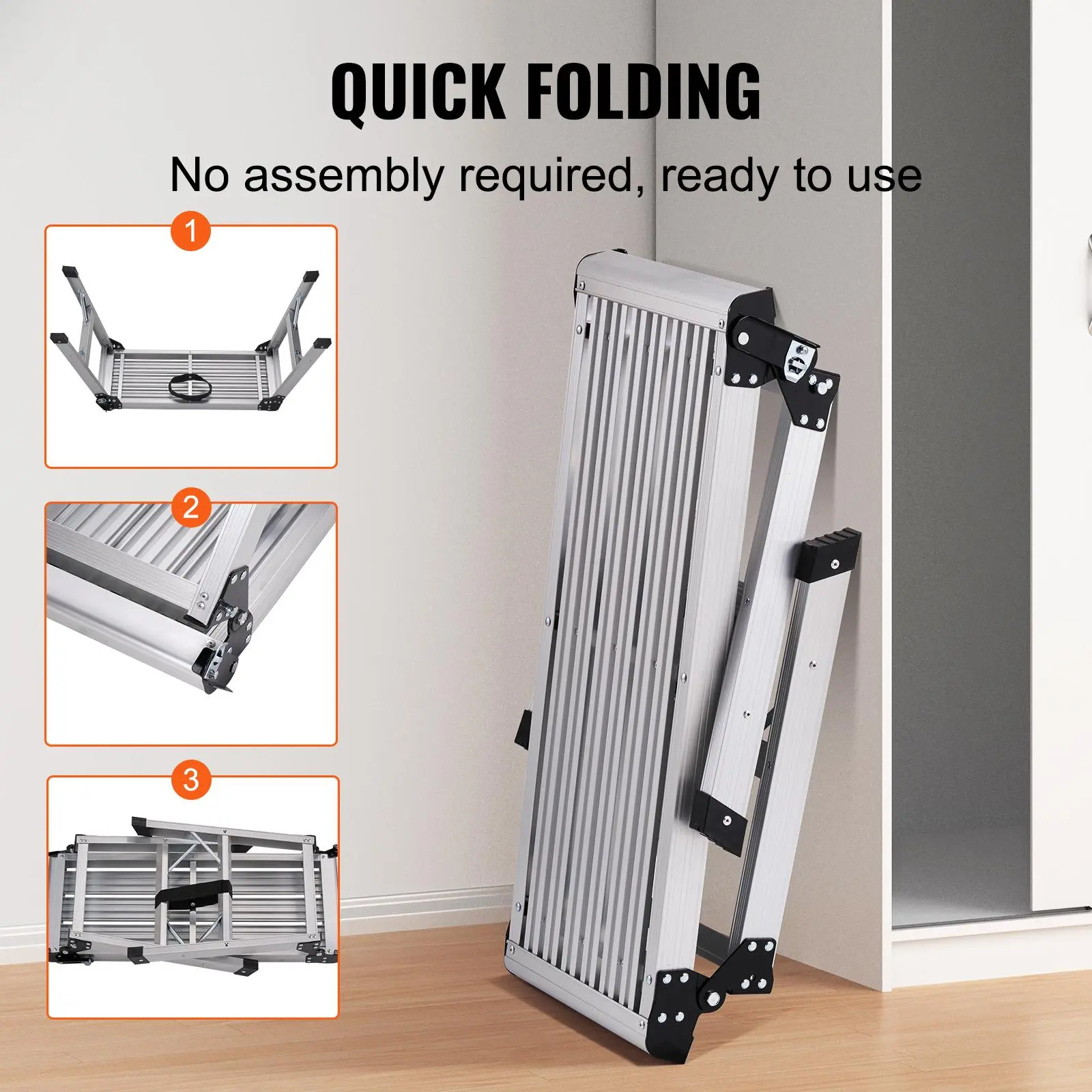 • Ultimate Durable Aluminum: Our folding platform is crafted from top-notch aluminum, ensuring resistance to rust and corrosion. Our platforms feature an impressive load capacity of up to 330 lbs, effortlessly bearing the weight of heavy equipment, materials, and tools.