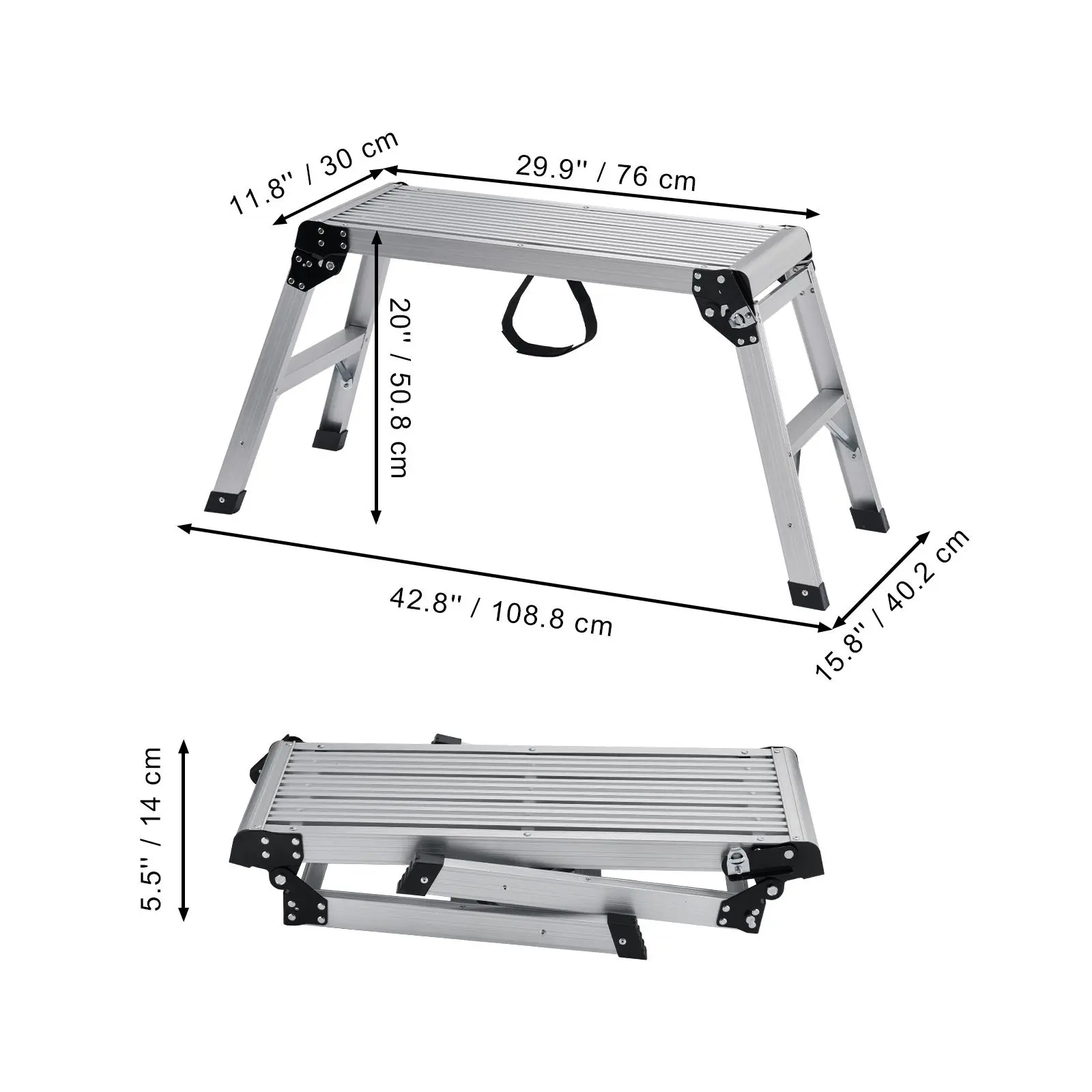 • Ultimate Durable Aluminum: Our folding platform is crafted from top-notch aluminum, ensuring resistance to rust and corrosion. Our platforms feature an impressive load capacity of up to 330 lbs, effortlessly bearing the weight of heavy equipment, materials, and tools.