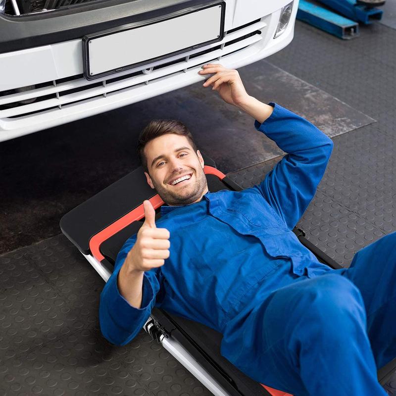 Includes four heavy-duty wheels (two with brakes) for mobility in car creeper, dolly, and hand truck configurations, plus adjustable mats at the bottom to protect various floor types, including rough or uneven surfaces.