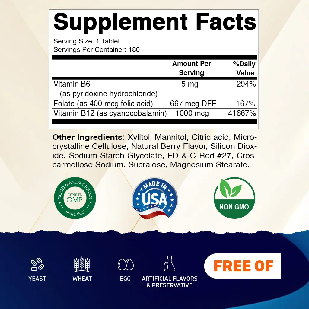- Made with Folic Acid, Vitamin B12, and Vitamin B6.