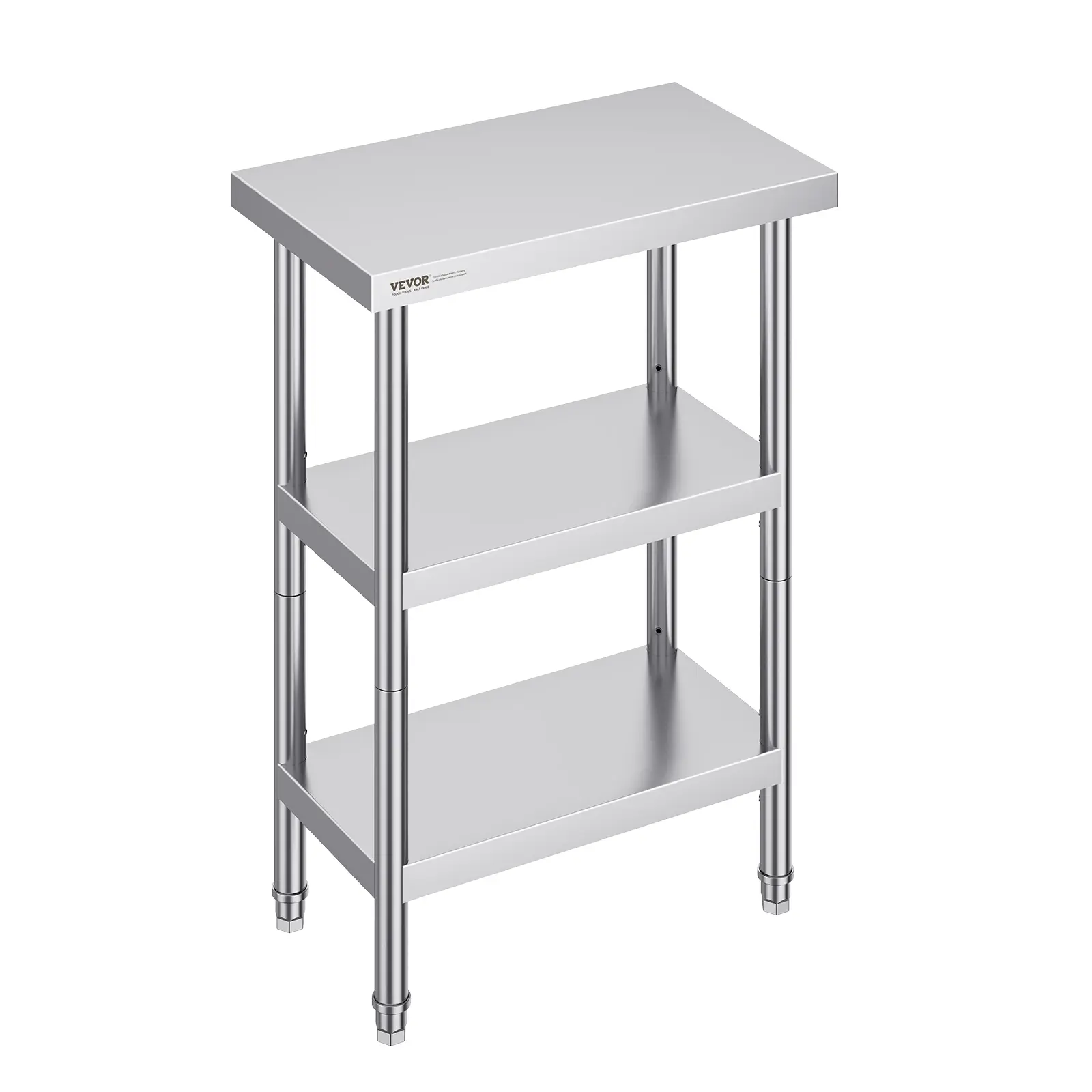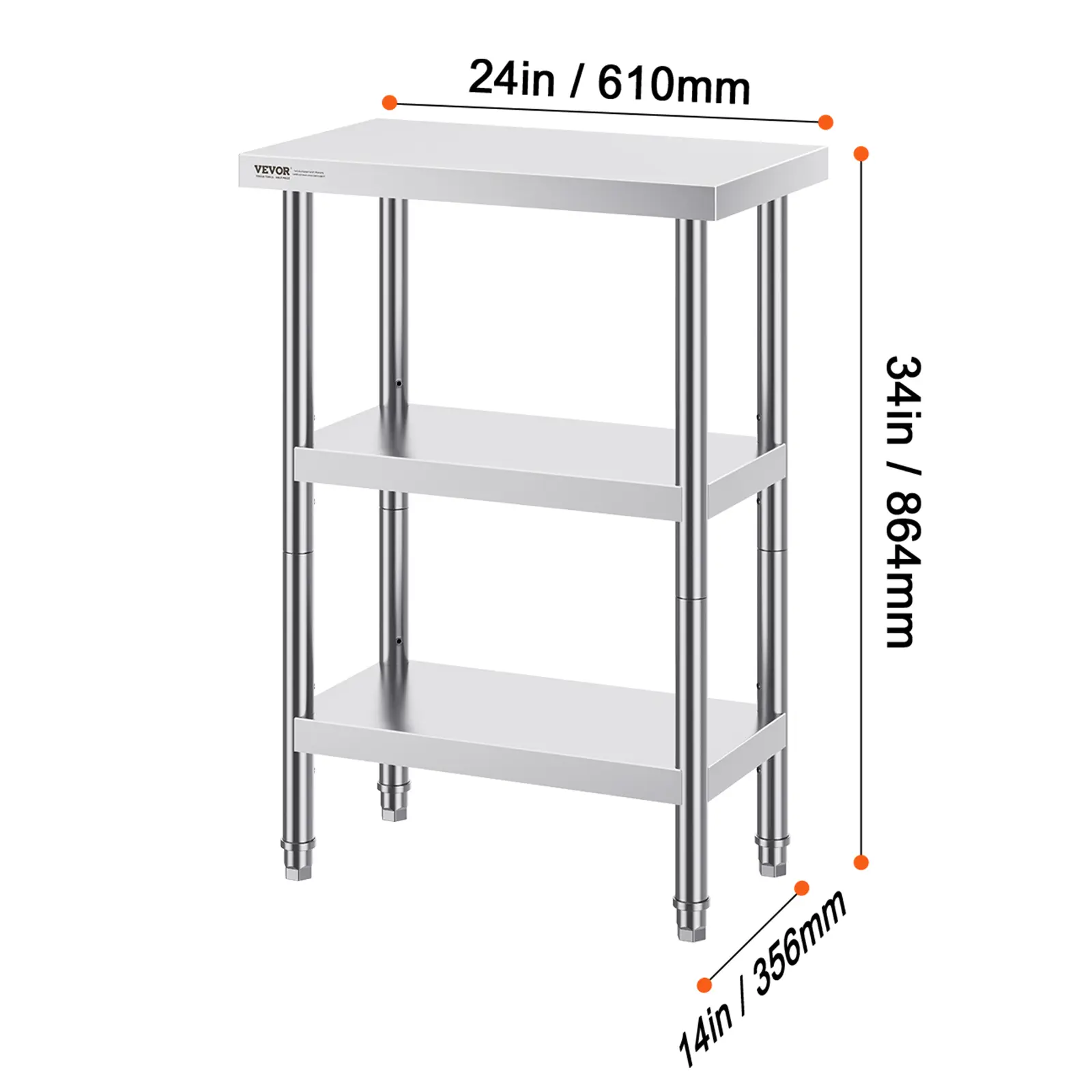 • High-Quality Stainless Steel: This work table, measuring 14 x 24 x 34 inch, is made from SUS201 stainless steel for the tabletop, shelves, and legs. It offers superior rust resistance, a sleek appearance, and a smooth surface that is easy to clean with a simple wipe. NSF certified, it meets strict public health standards, ensuring long-lasting protection for your health.