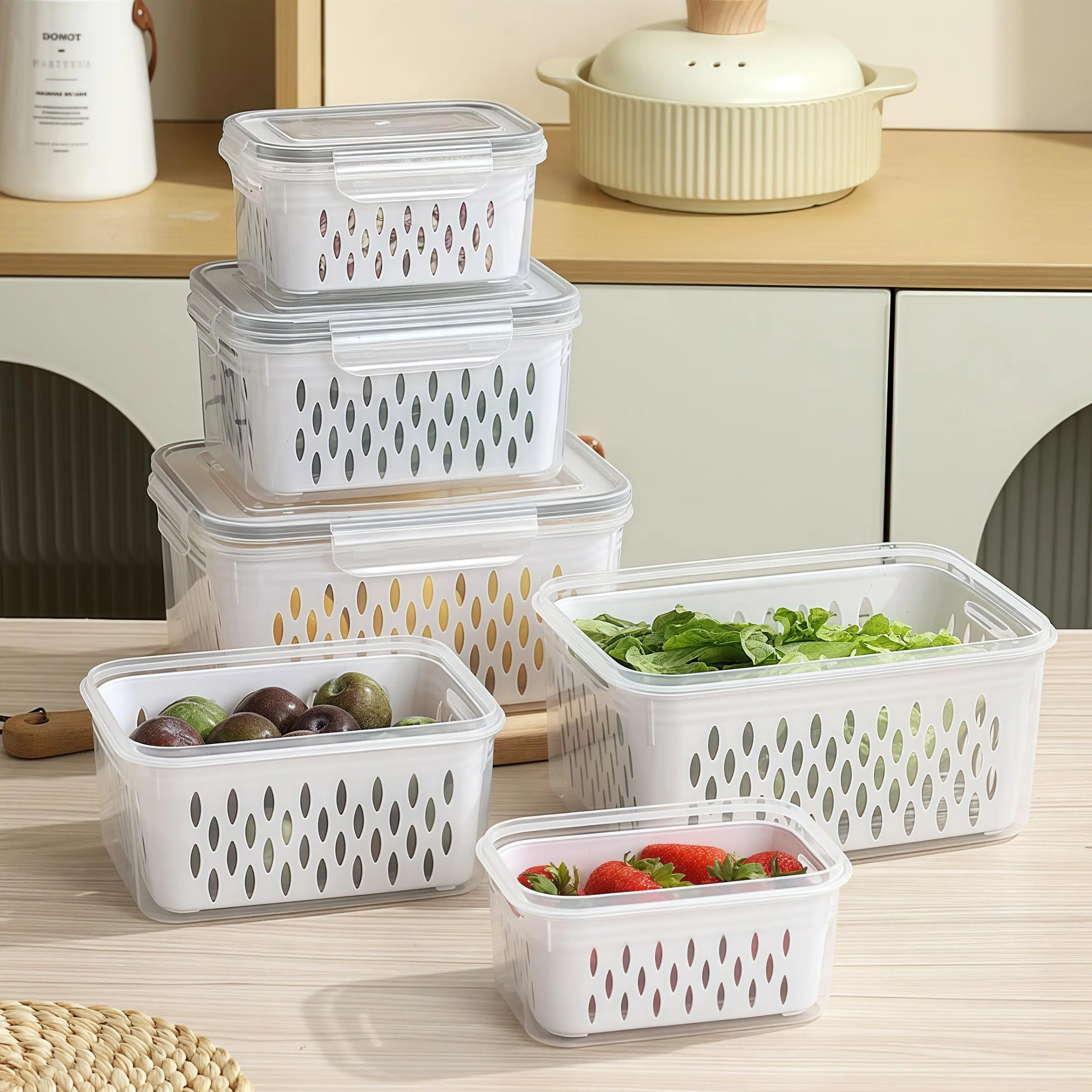 Food Storage Box with Lid, 6 Counts/set Including 3 Reusable Fruit & Vegetable Storage Container & 3 Drainers, Stackable Food Storage Box for, Home Kitchen Outdoor Picnic, Utensils, Stackable Fridge Organizer
