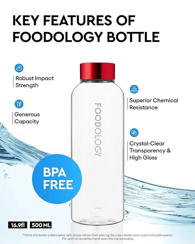Stay hydrated on your adventures with the FOODOLOGY Bottle. This leak-proof, lightweight design is perfect for gym, outdoor, and travel use. It holds 16.9 fluid ounces of your favorite beverage. The clear container ensures you can easily monitor your intake. BPA-free, it's safe for repeated use.
