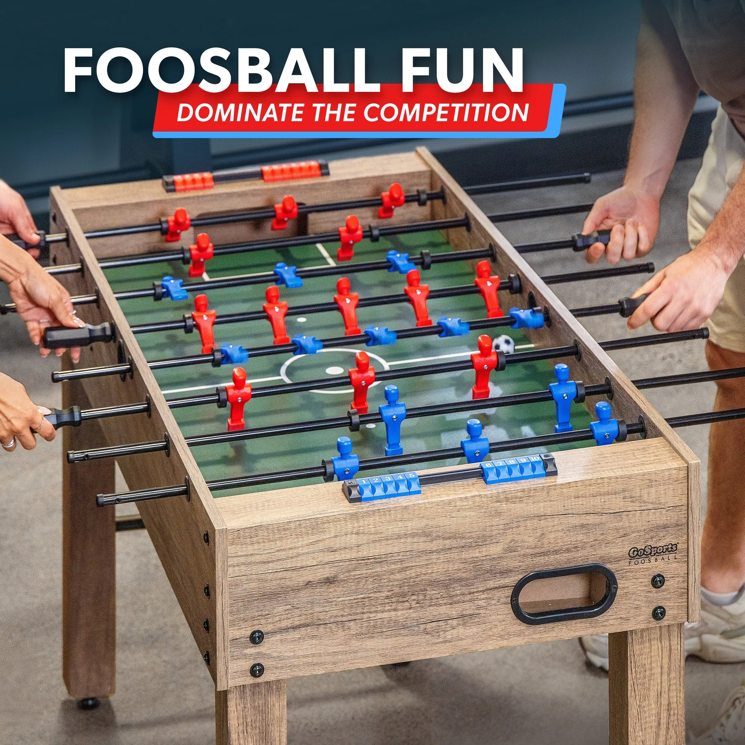 Get ready for action-packed games in the comfort of your own home! The GoSports Foosball Table encourages players of all ages (8+) and abilities to break free from their tablets and screens for traditional fun. At 48 in long, the table is the ideal size for virtually any gameroom, kids bedroom, garage, basement, man cave, and more. Featuring a sleek black matte finish and accented with modern red/blue players, our foosball table can be used as a complementary furniture piece in any home. Better yet, it's not just stylish, but durable. We know that foosball can be a highly competitive and energetic interactive game, so we've designed our table to withstand such gameplay. We've also included 4 soccer balls in case a ball goes missing during a heated match, as well as 2 cup holders so you can easily access your favorite beverages while playing. Bring friends and family together with GoSports Foosball!