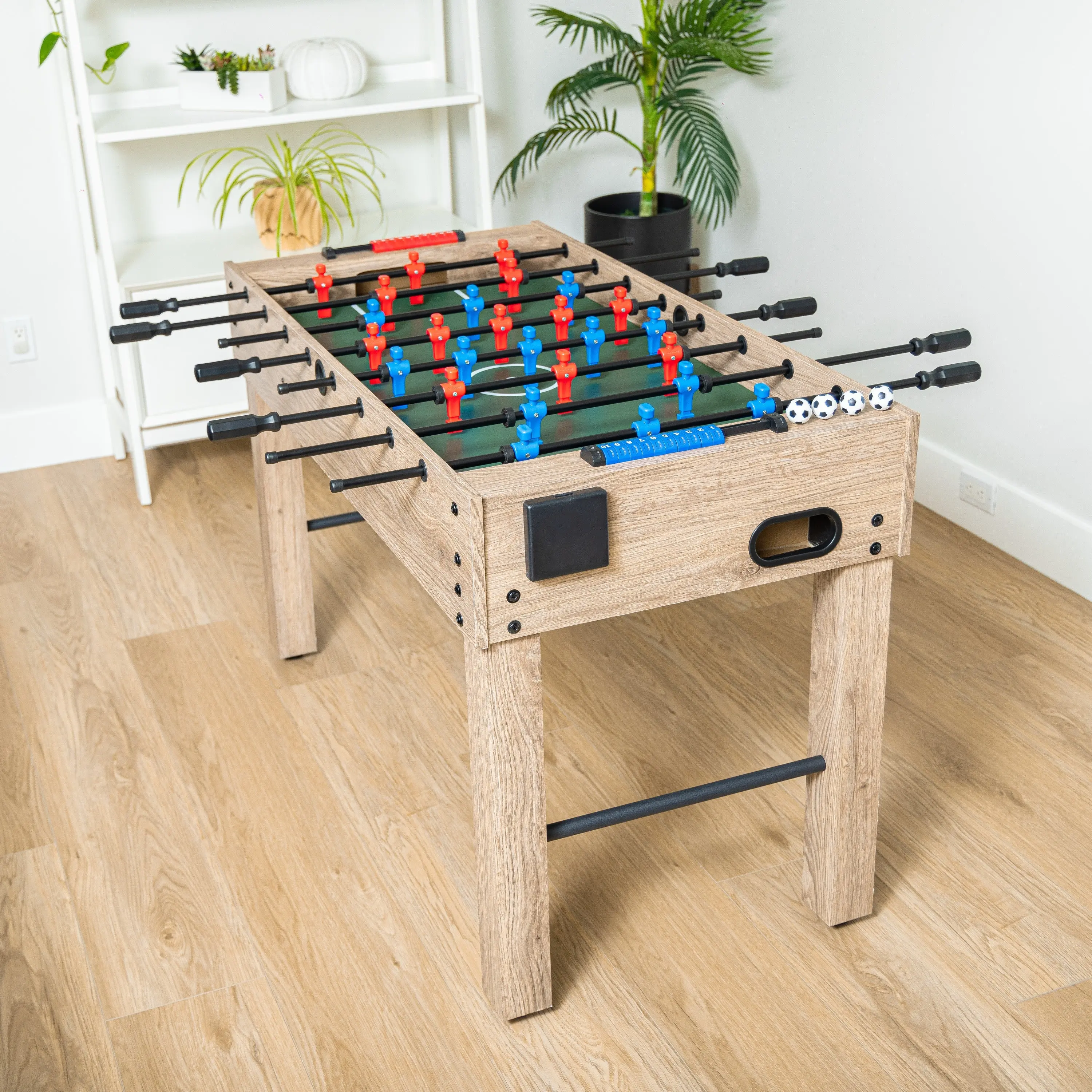 ·MODERN DESIGN: Features an updated style and color scheme that complements your home decor; Modern oak finish with a low friction playing field and vibrant red and blue players