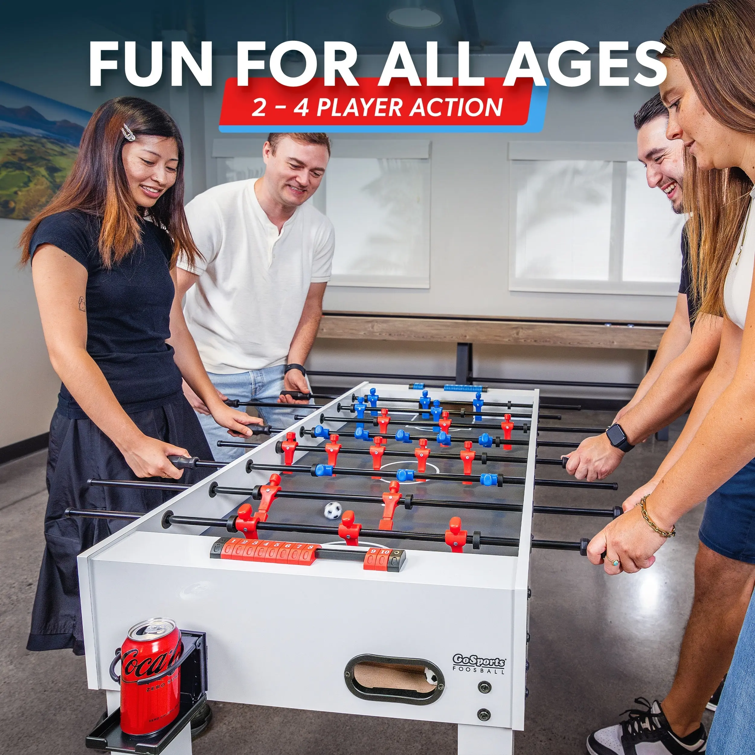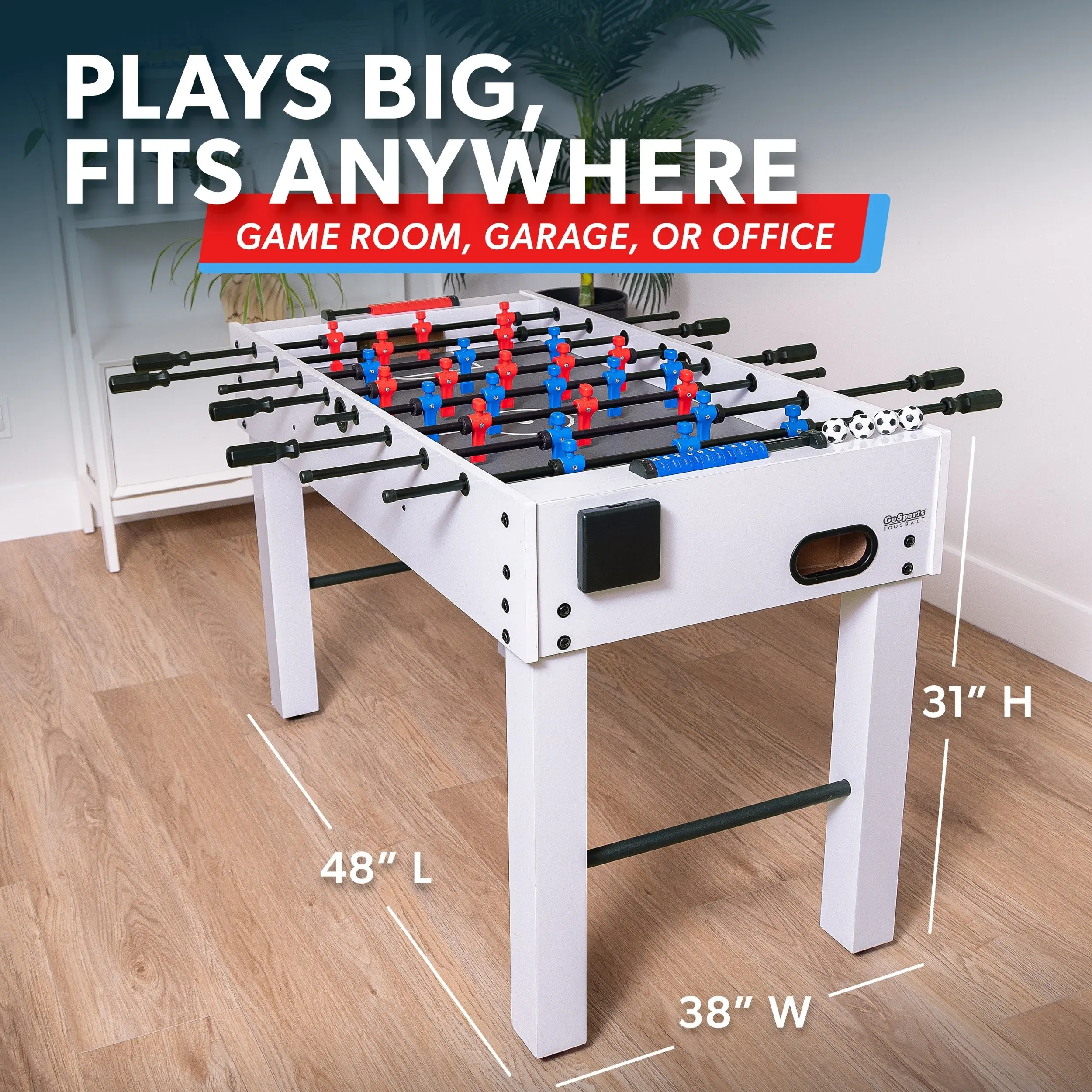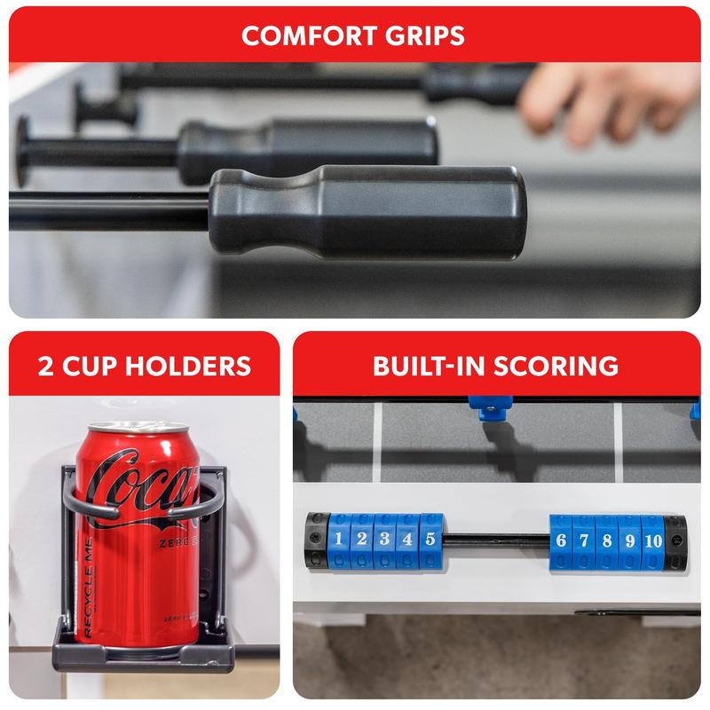 Get ready for action-packed games in the comfort of your own home! The GoSports Foosball Table encourages players of all ages (8+) and abilities to break free from their tablets and screens for traditional fun. At 48 in long, the table is the ideal size for virtually any gameroom, kids bedroom, garage, basement, man cave, and more. Featuring a sleek black matte finish and accented with modern red/blue players, our foosball table can be used as a complementary furniture piece in any home. Better yet, it's not just stylish, but durable. We know that foosball can be a highly competitive and energetic interactive game, so we've designed our table to withstand such gameplay. We've also included 4 soccer balls in case a ball goes missing during a heated match, as well as 2 cup holders so you can easily access your favorite beverages while playing. Bring friends and family together with GoSports Foosball!