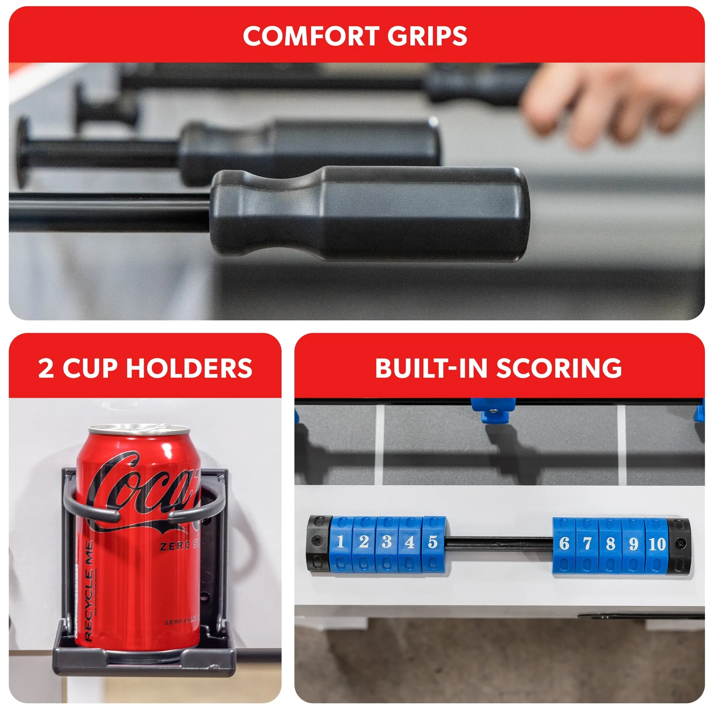 ·PREMIUM QUALITY: The frame is constructed from sturdy composite wood and player pieces & foosballs are made from durable plastic to withstand long term use; Features upgraded ergonomic handles for comfort and shot accuracy