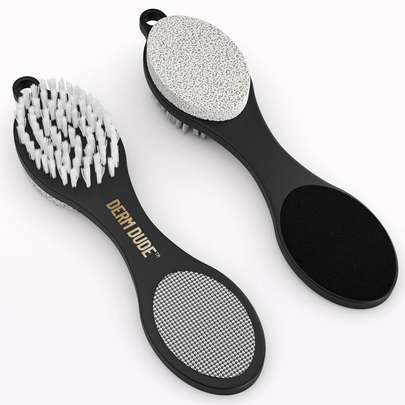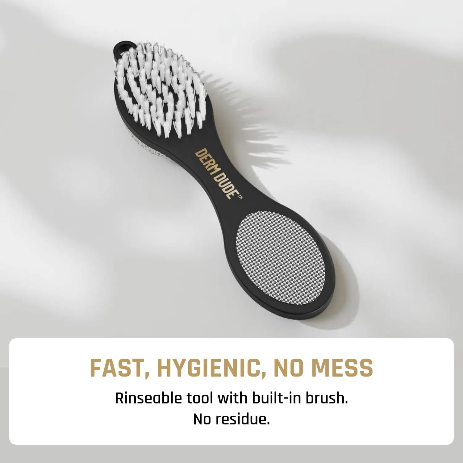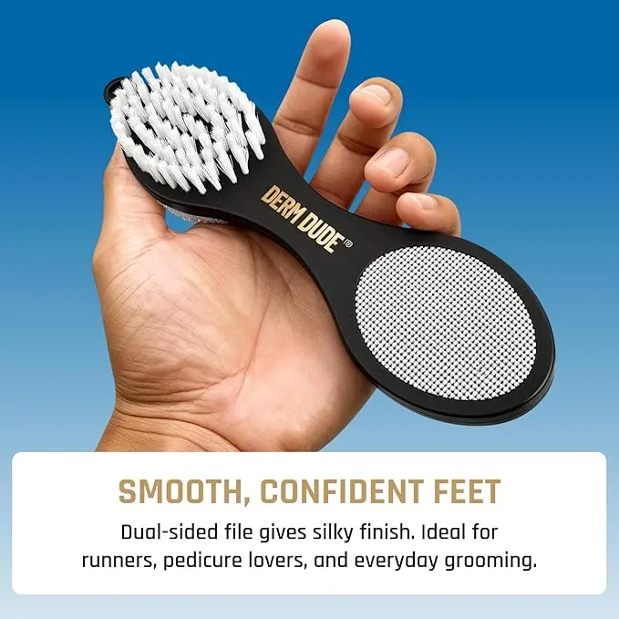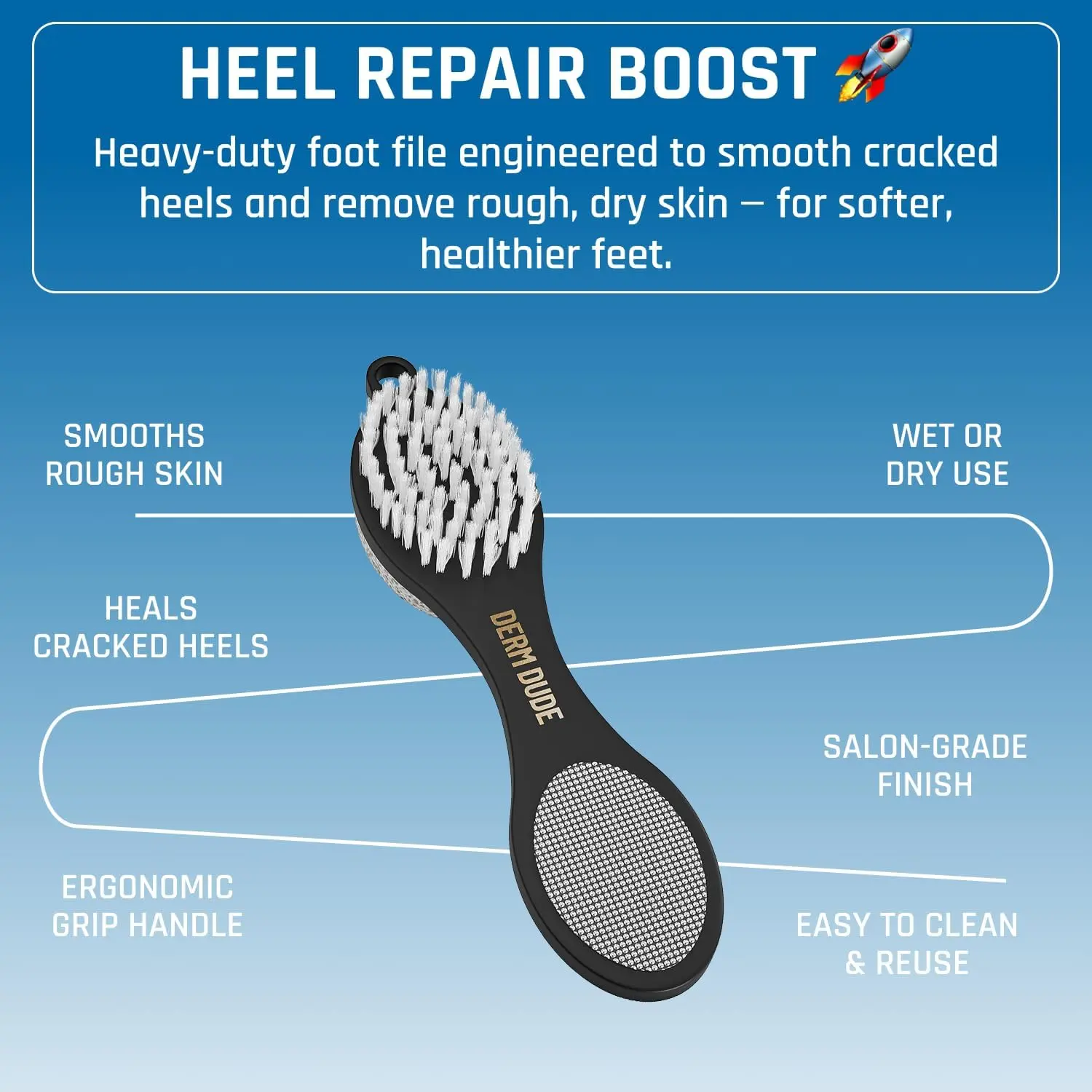 The Foot File & Heel Repair Tool is a versatile grooming accessory. It features a dual-sided design with a brush and a file. The brush has white bristles, while the file is textured for effective smoothing. The tool is branded "DERM DUDE." Ideal for foot care, it offers both scrubbing and filing functions.