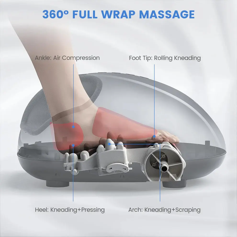 Key Functions: Deep Kneading, Compression, Scraping, Rolling, Heating | Core Benefits: Relieves Foot Tiredness & Soreness, Reduces Stress, Boosts Circulation, Promotes Whole-Body Relaxation