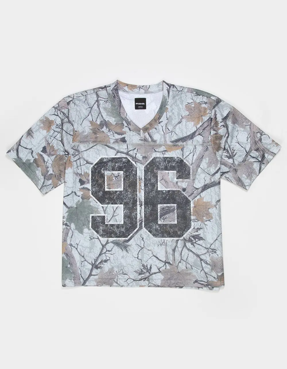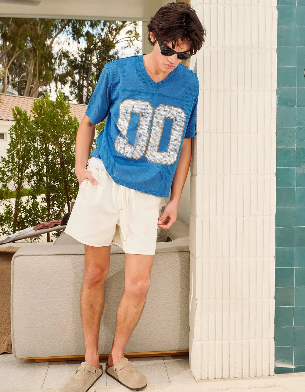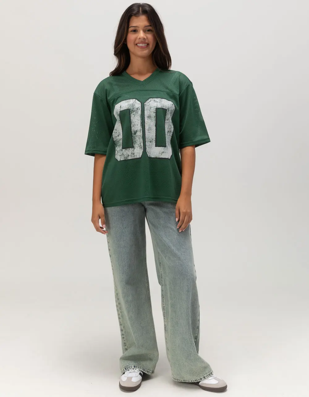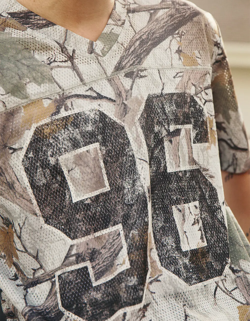 RSQ Mesh Football Tee. Allover mesh football tee with distressed uniform number screened on front. V-neck. Short sleeve. 100% Polyester. Machine wash. Imported. | RSQ Mesh Boxy Football Jersey