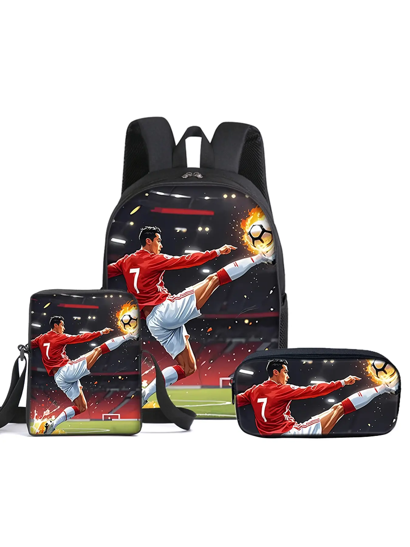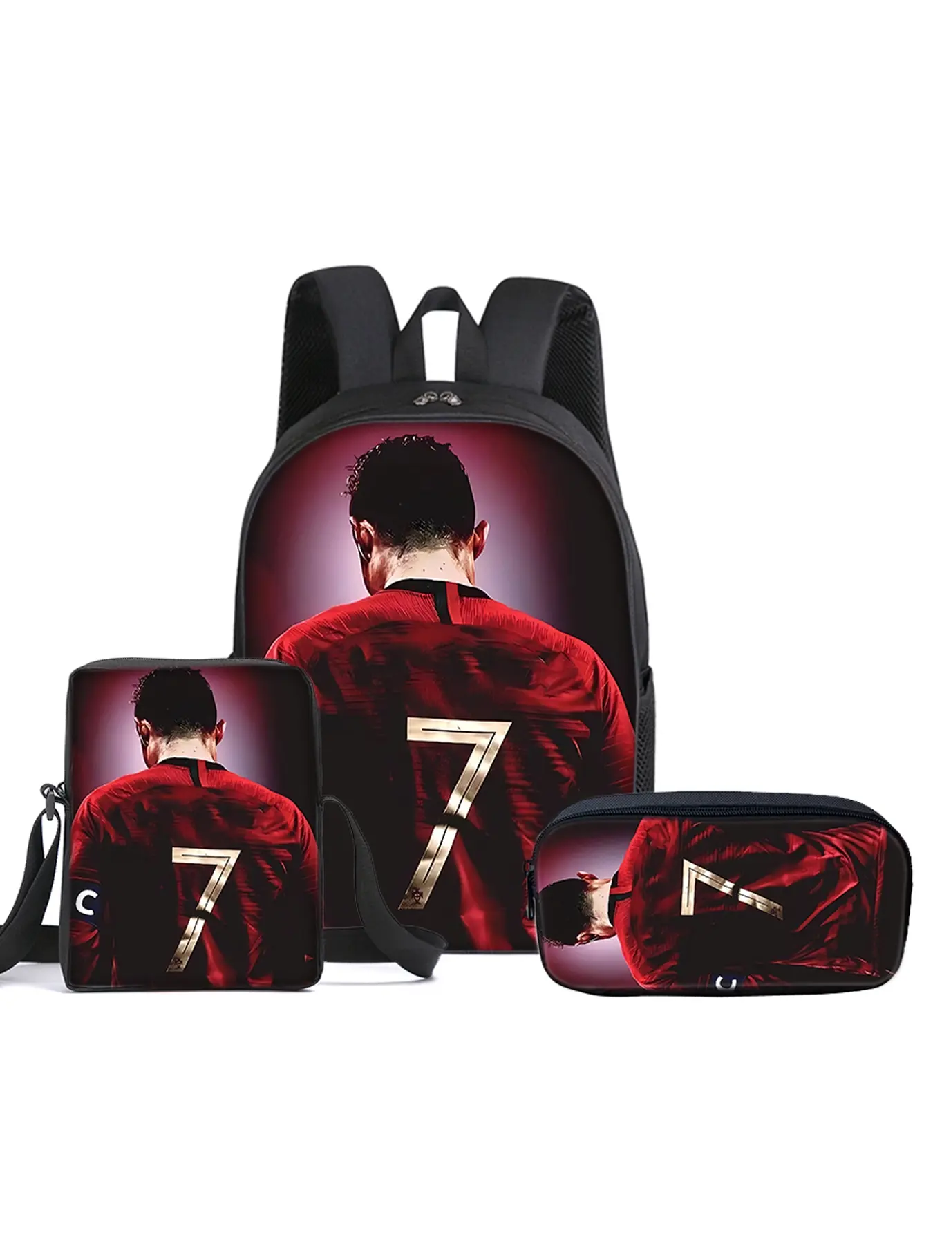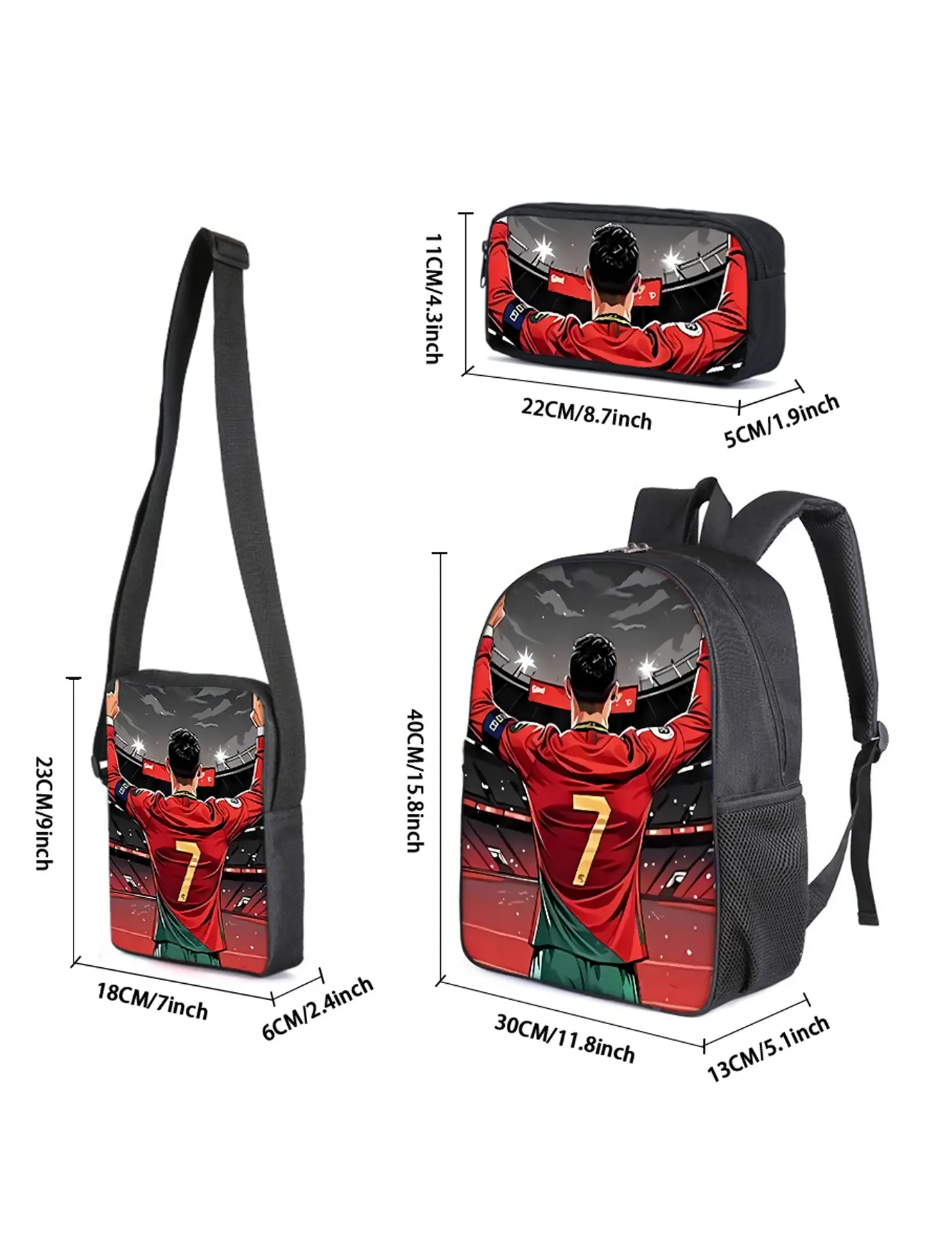 CR7 Football pattern printed 16-inch Soccer Backpack three-piece set (single-layer backpack + small shoulder bag + single-layer pencil bag)