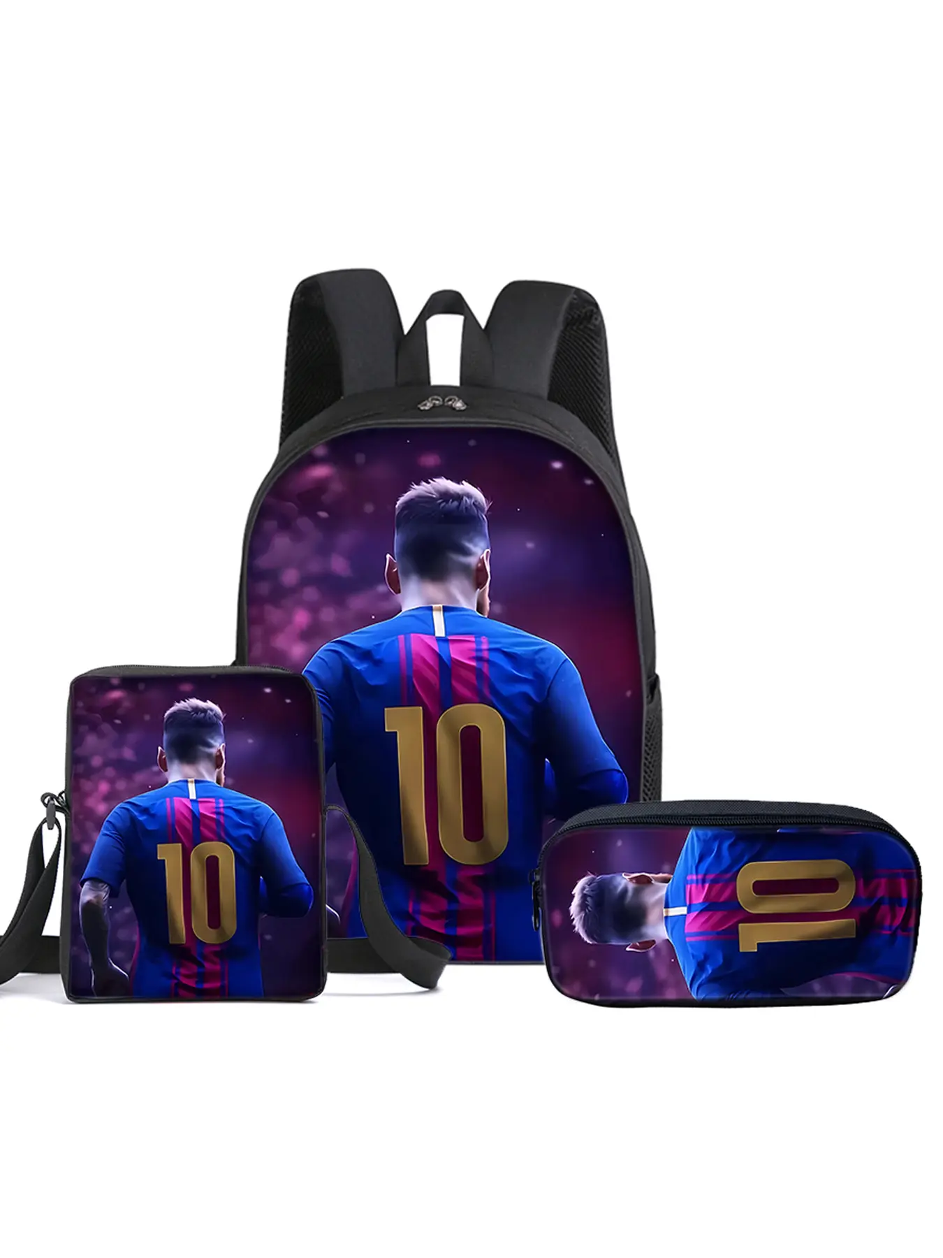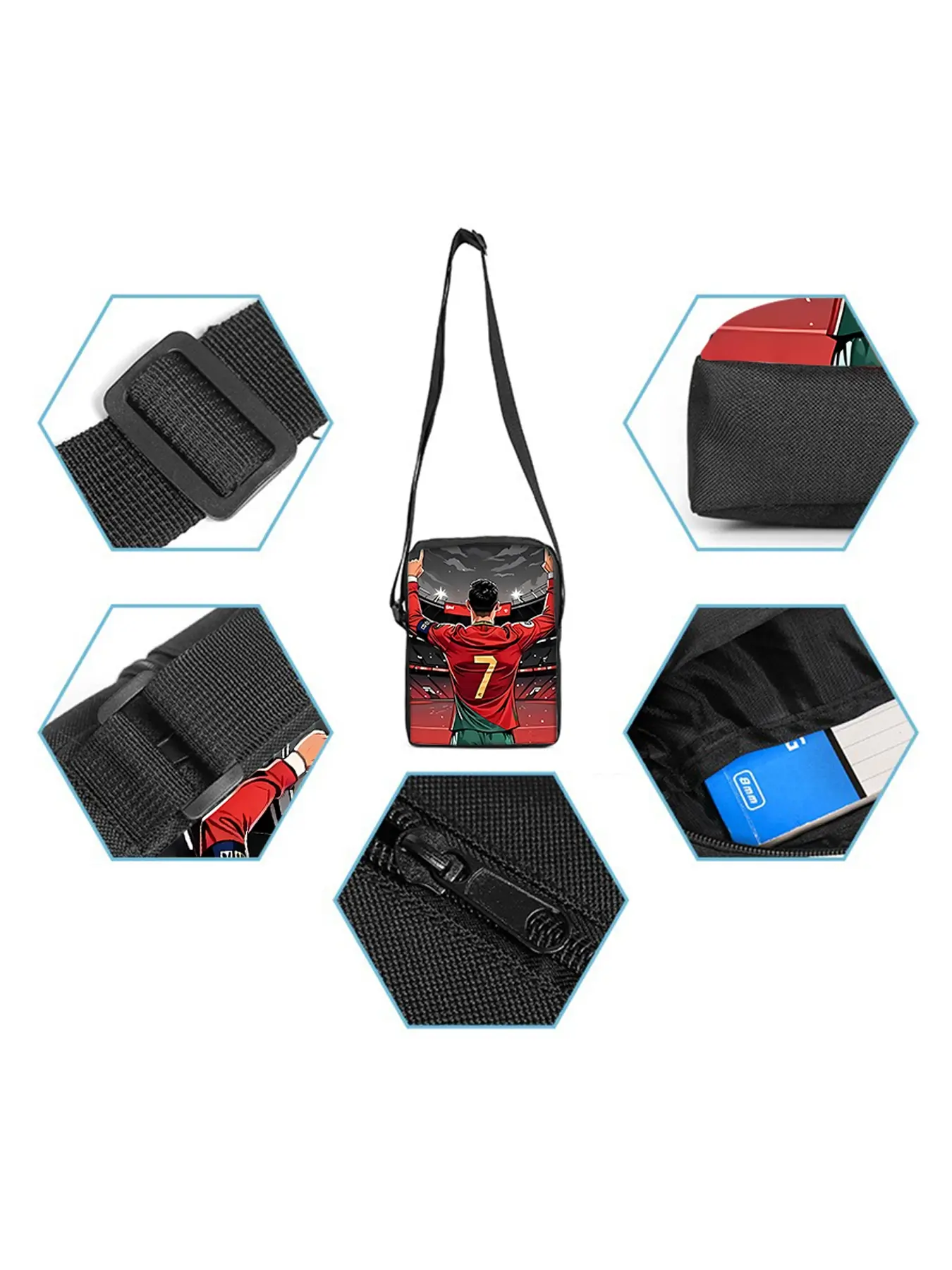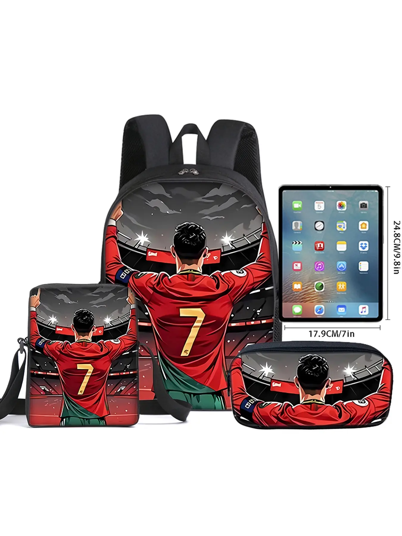 CR7 Football pattern printed 16-inch Soccer Backpack three-piece set (single-layer backpack + small shoulder bag + single-layer pencil bag)