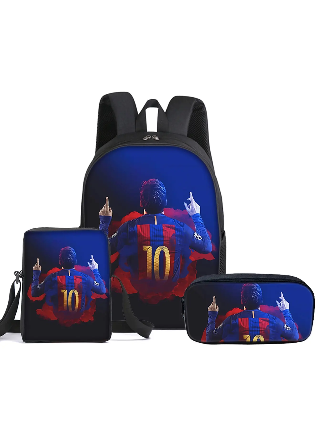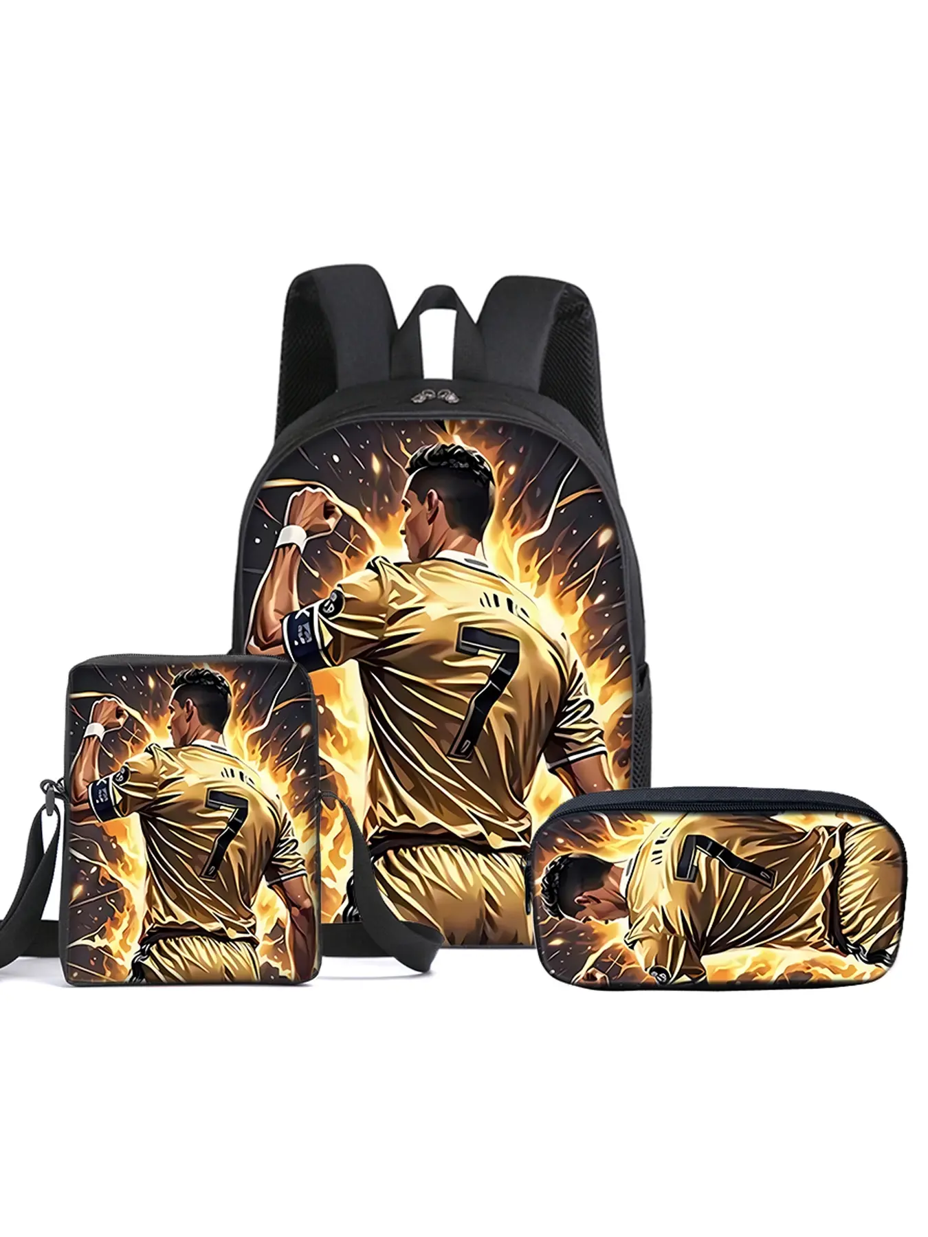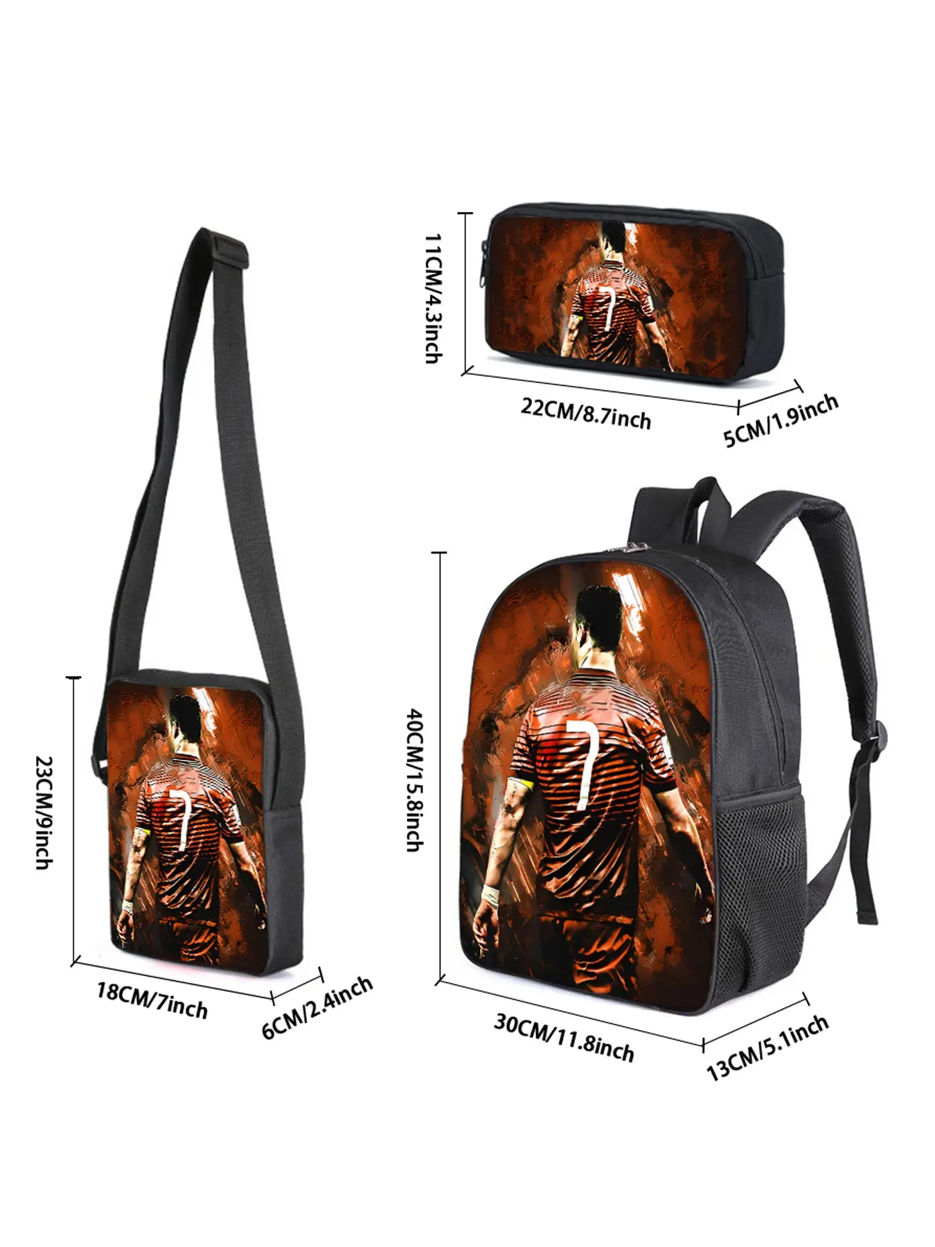 CR7 Football pattern printed 16-inch Soccer Backpack three-piece set (single-layer backpack + small shoulder bag + single-layer pencil bag)