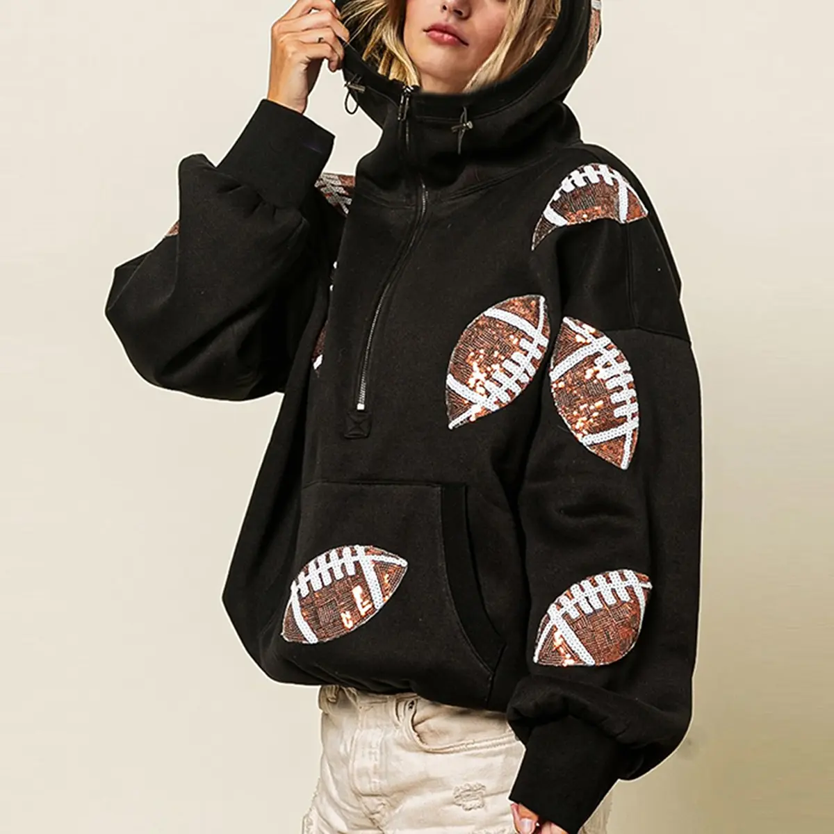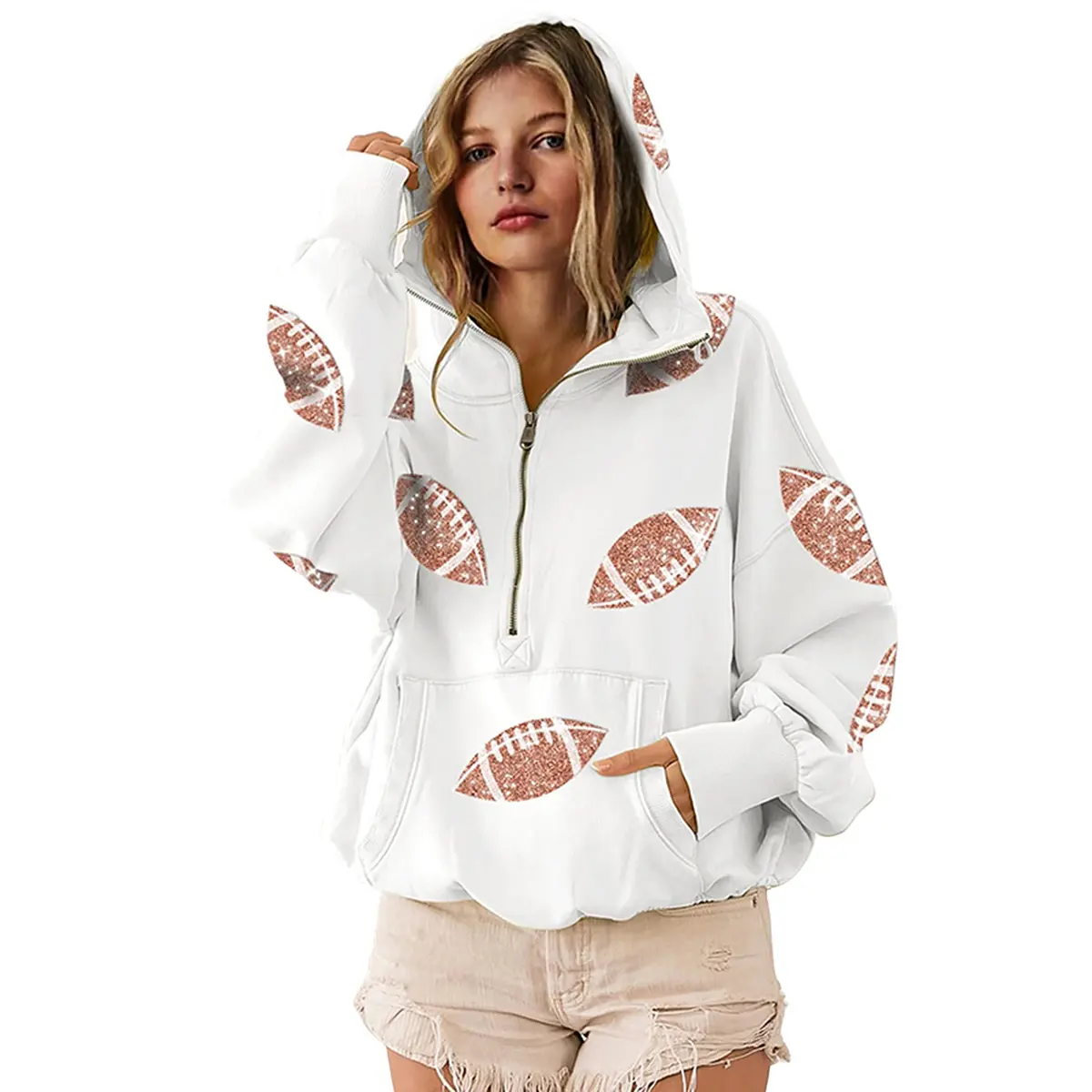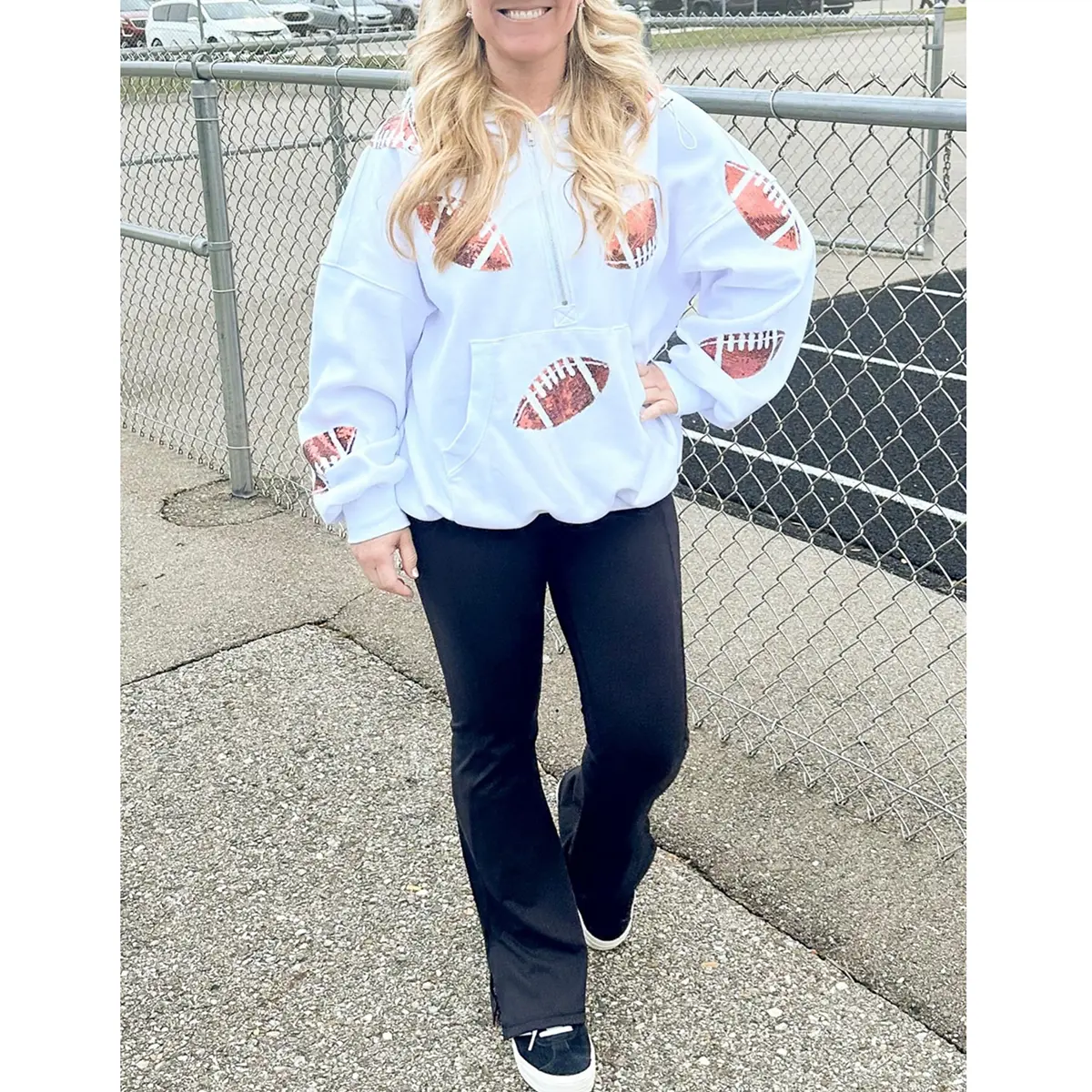 Super cute and soft. Love the sequined footballs. Love to watch football but, Im a girlie girl through and through. Perfect Sunday gameday hoodie