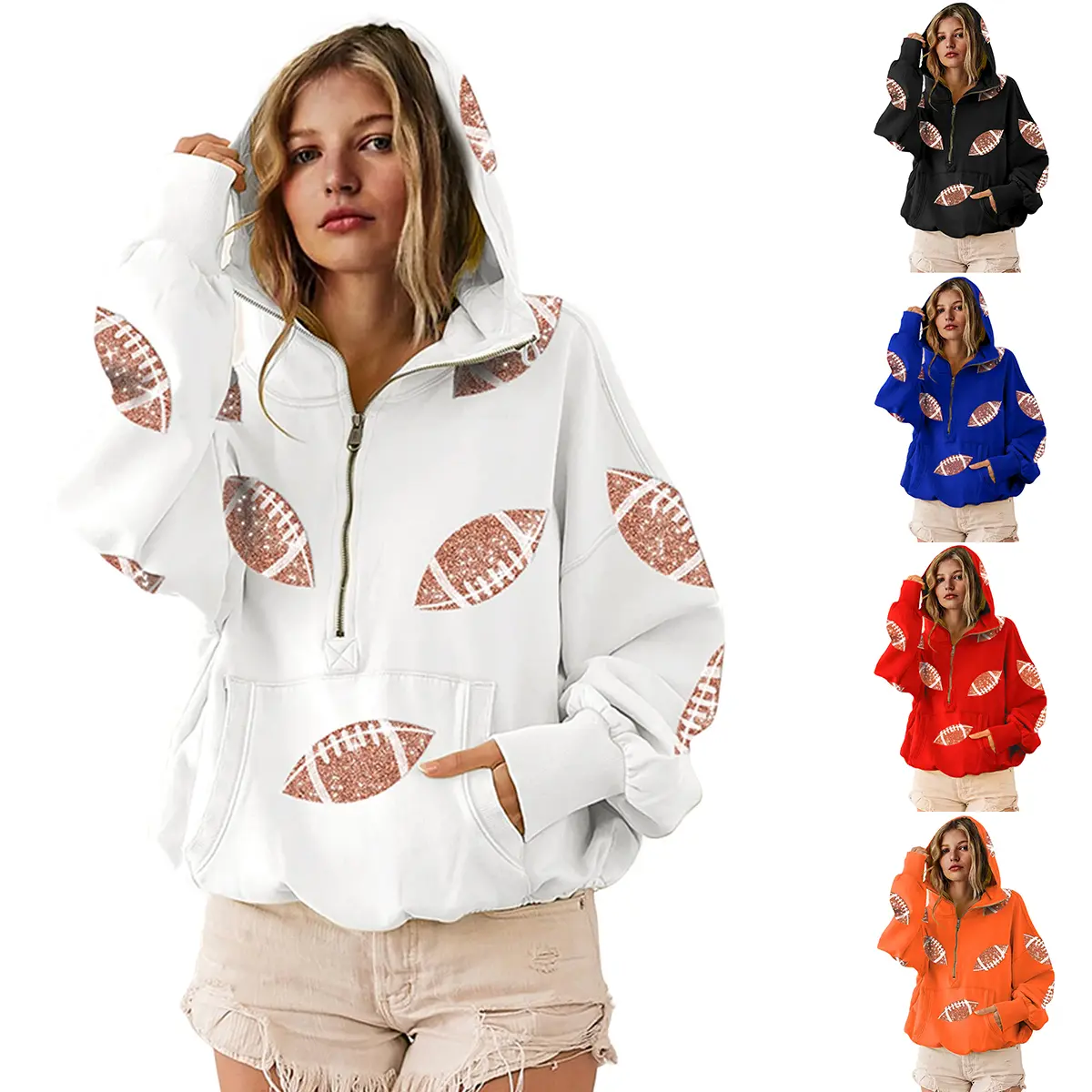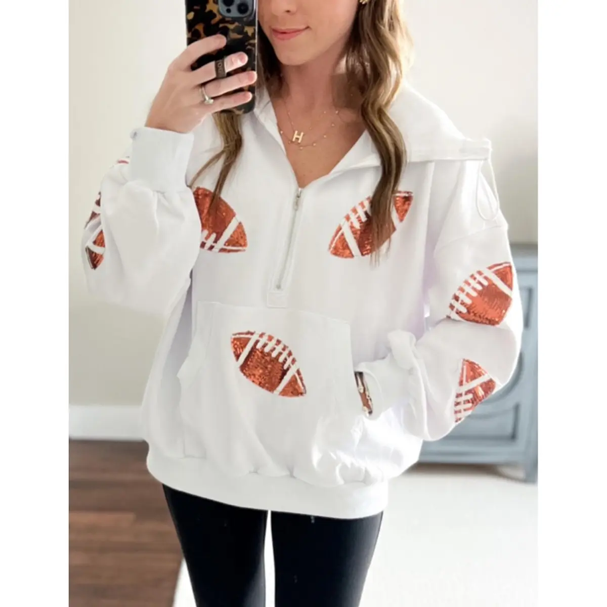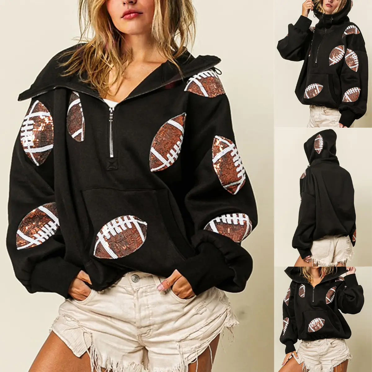 Super cute and soft. Love the sequined footballs. Love to watch football but, Im a girlie girl through and through. Perfect Sunday gameday hoodie