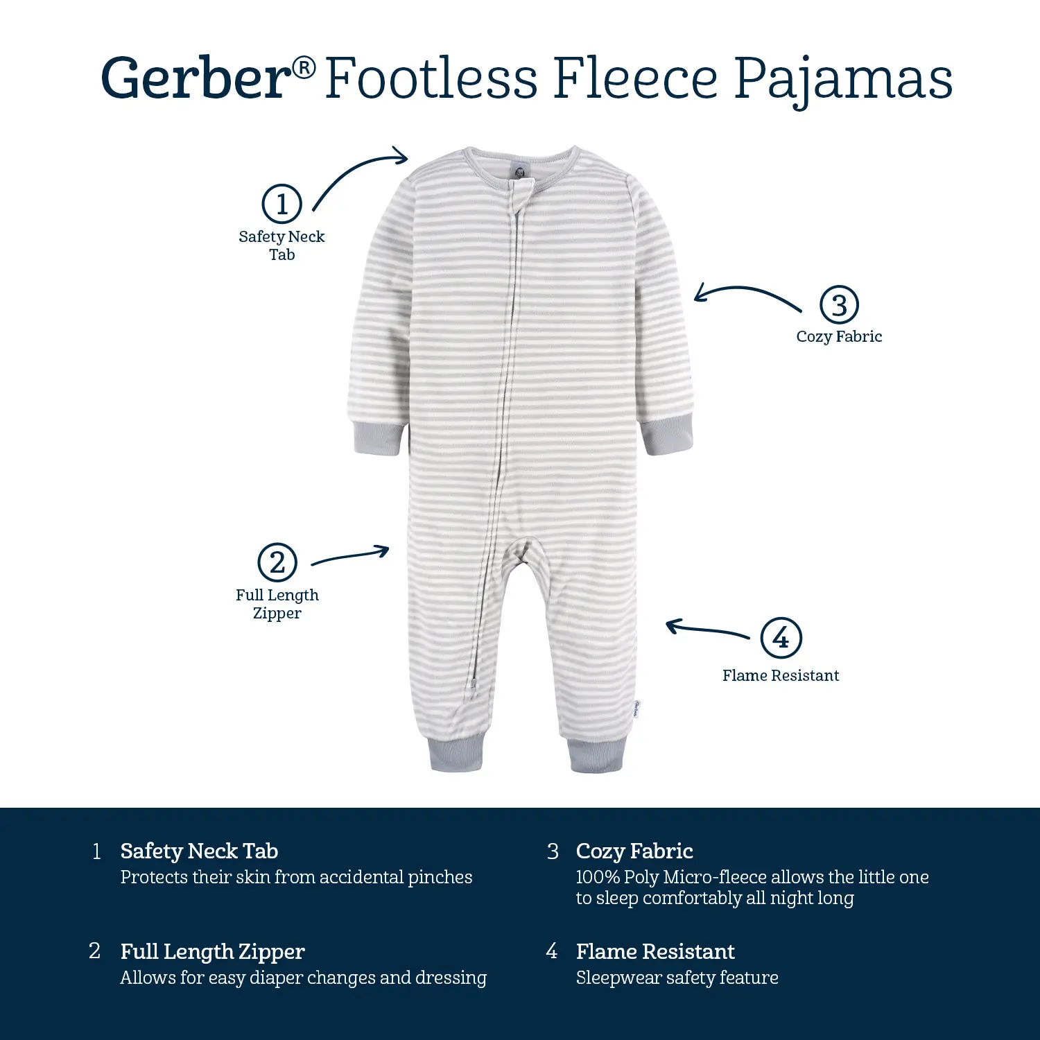 Snuggle up in style and warmth! Our footed pajamas are made from ultra-soft microfleece to ensure the coziest bedtime experience. Featuring a practical two-way zipper and a neckline protector to prevent pinching, these fleece pajamas simplify dressing and diaper changes. This pack offers a variety of cute designs, making bedtime routines a memorable time. Our essentials have been independently certified with STANDARD 100 by OEKO-TEX® so that you don’t have to worry about harmful substances in your baby’s wardrobe. Flame resistant for child safety. Pack includes three fleece pajamas.