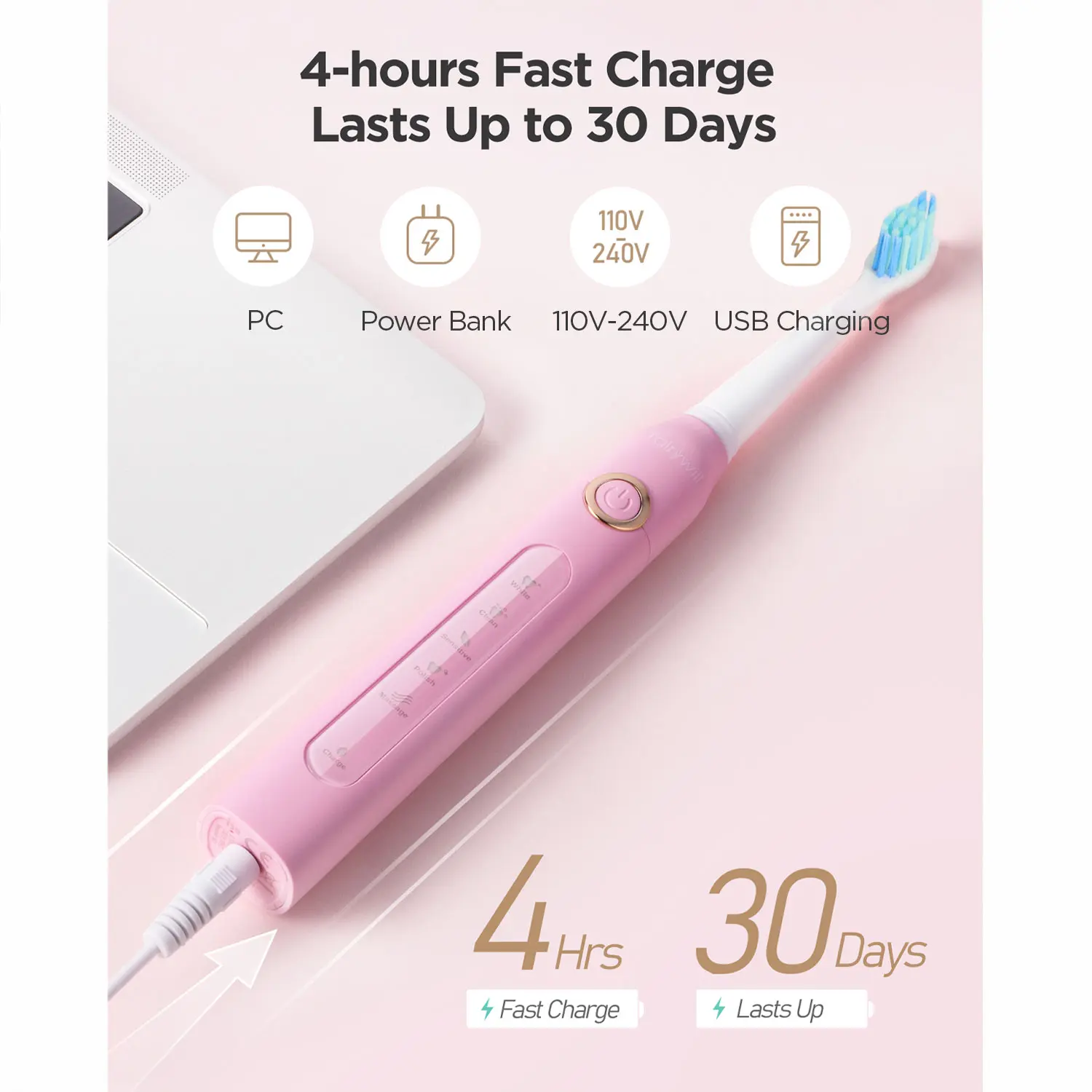 【Worry-Free Battery Life and Handy to Charge】4 Hours' Charge support 30 days' use. DC Cable charging, safe and easy, auto shut off after full charge, compatible with any power source. Electric toothbrush convenient to use at home or travel. Low battery reminding.