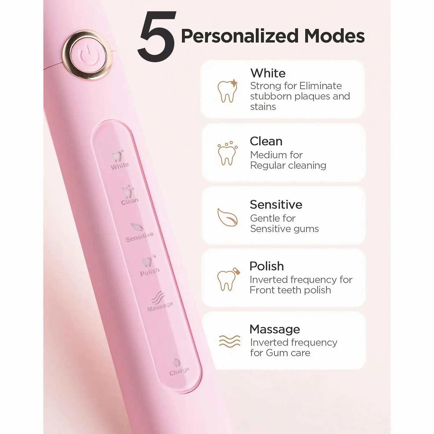 5 Modes of White, Clean, Sensitive, Polish, Massage to suit different conditions of teeth and gums; keep your teeth healthy and strong for a lifetime