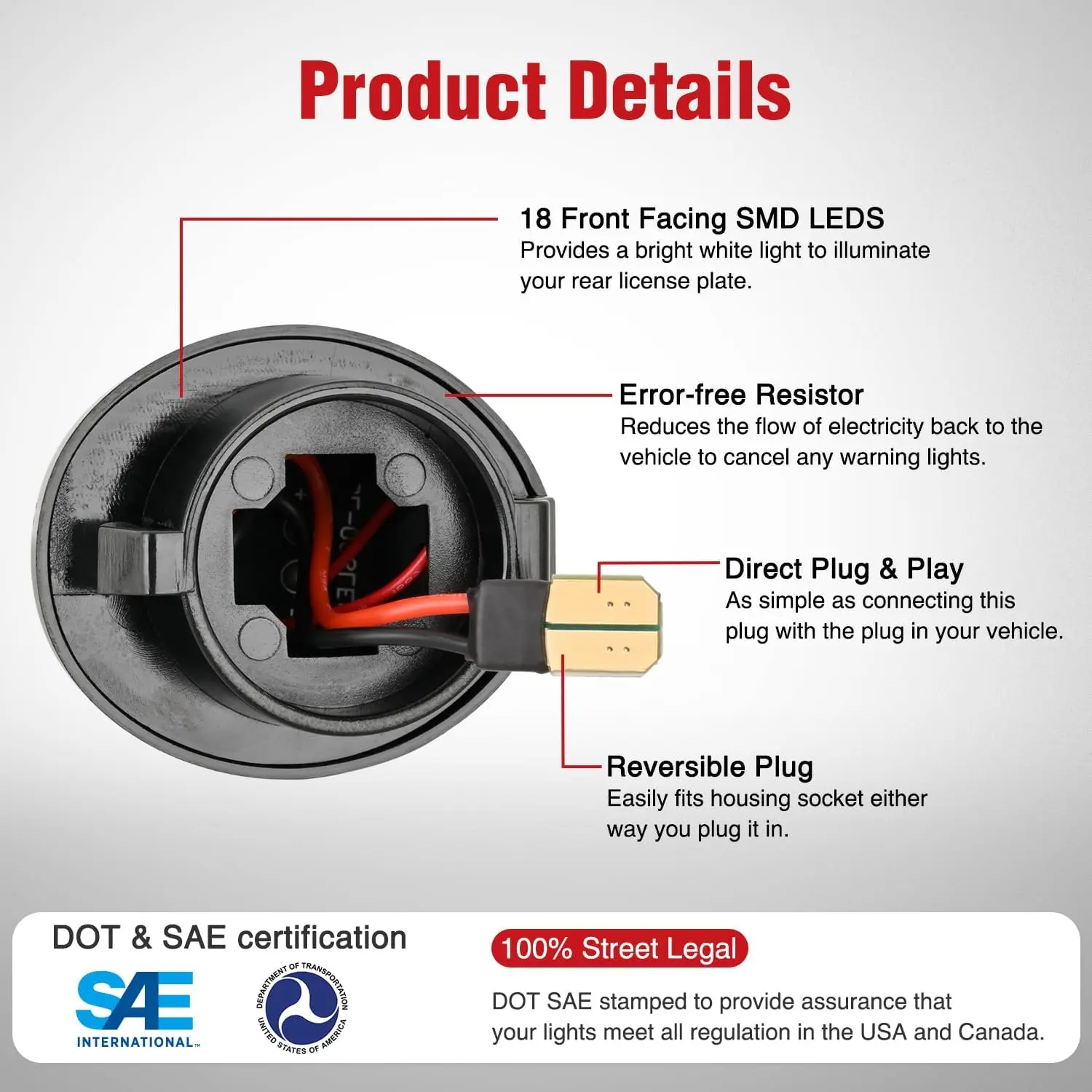 Built-in high power 18 SMD LED chips, super bright 6000k white light output effectively illuminate the license plate. LED license plate lights ensure that your license plate tag lights remain visible in low light and nighttime conditions.