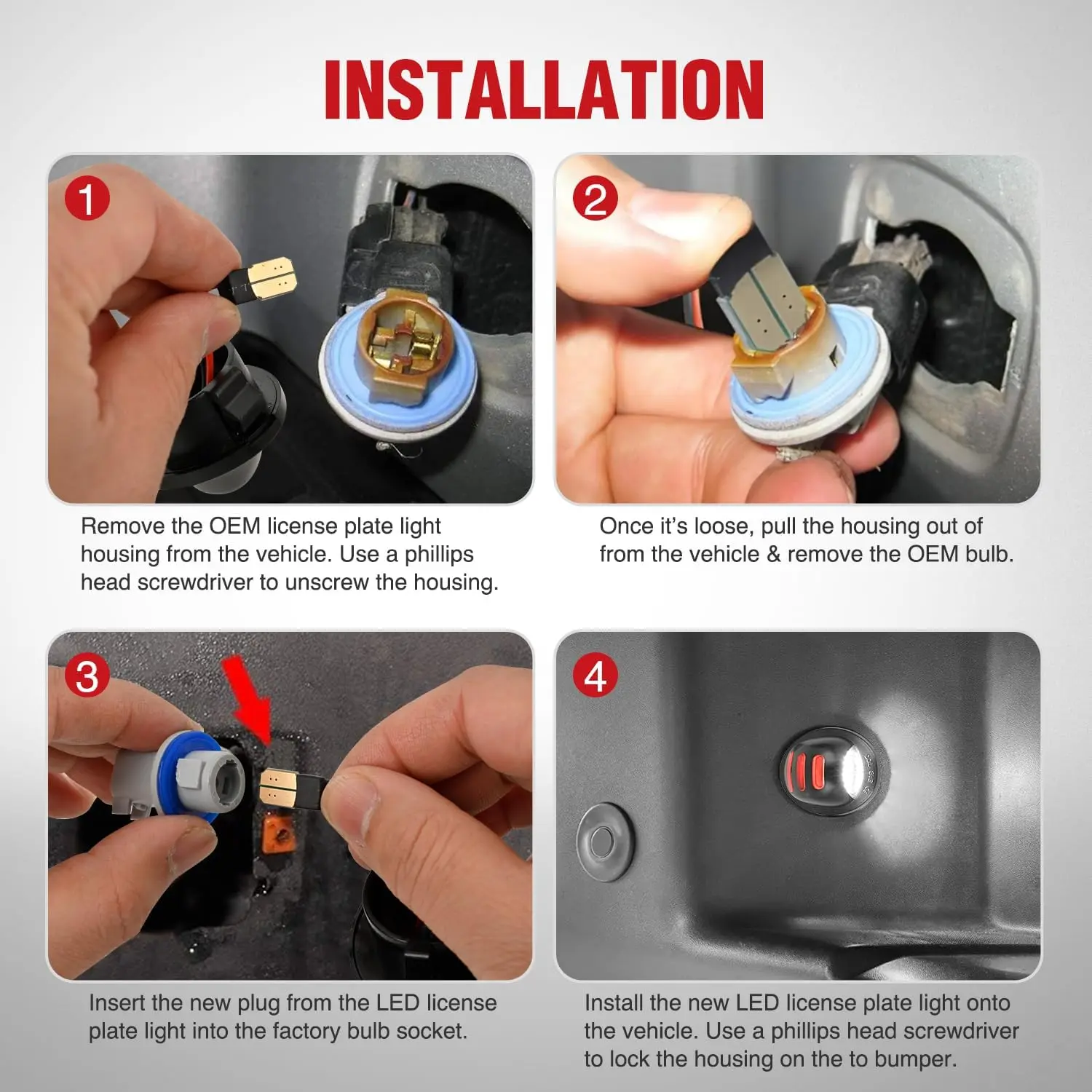 Install the new LED license plate light onto the vehicle. Use a phillips head screwdriver to lock the housing on the to bumper.
