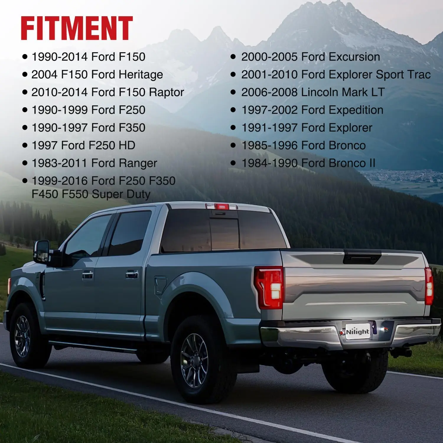 ·Vehicle fitment: The License Plate Light Lamp Compatible with 1990-2014 Ford F150; 2004 F150 Ford Heritage; 2010-2014 Ford F150 Raptor; 1990-1999 Ford F250; 1990-1997 Ford F350; 1997 Ford F250 HD; 1999-2016 Ford F250 F350 F450 F550 Super Duty; 1983-2011 Ford Ranger; 2000-2005 Ford Excursion; 2001-2010 Ford Explorer Sport Trac; 2006-2008 Lincoln Mark LT; 1997-2002 Ford Expedition; 1991-1997 Ford Explorer; 1985-1996 Ford Bronco; 1984-1990 Ford Bronco II. Please confirm the vehicle fitment before ordering.