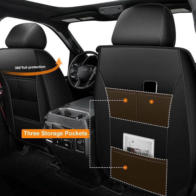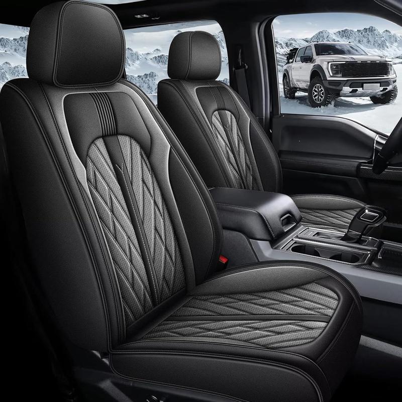 【LEATHER MATERIAL】: These truck seat covers for the Ford F150 are made of high quality perforated leather soft, breathable and comfortable, offering a pleasant driving experience whether you're commuting daily or embarking on a long journey. This seat covers is durable and wear-resistant, it can well protect your original car seats from damage, effectively extend the life of your Ford F150 truck interior.
