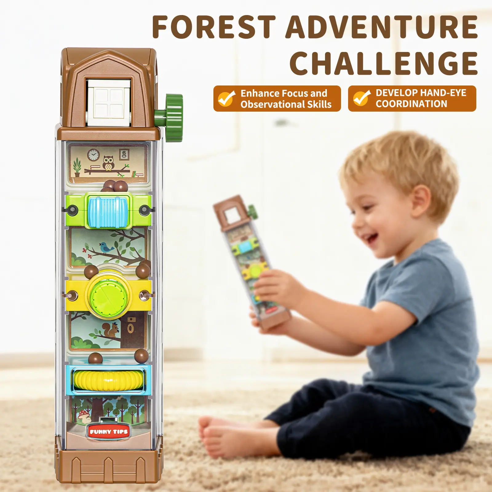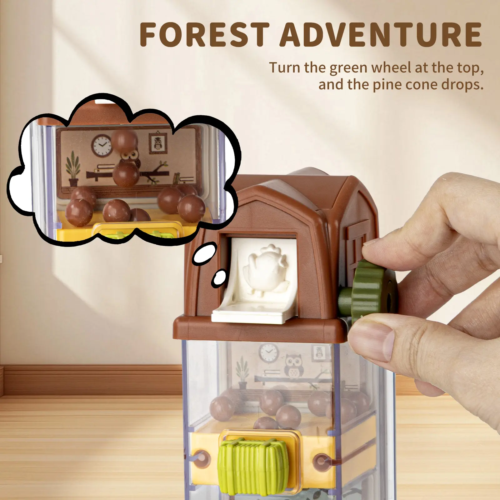 Fun Pine Cone Drop: Your toddler will love sending 12 brown pine cones on an adventure! After operating the modules to drop the pine cones, the fun continues: babies can manually turn the spiral wheel at the bottom to transport the pine cones back to the top, repeating the cycle for endless fun.