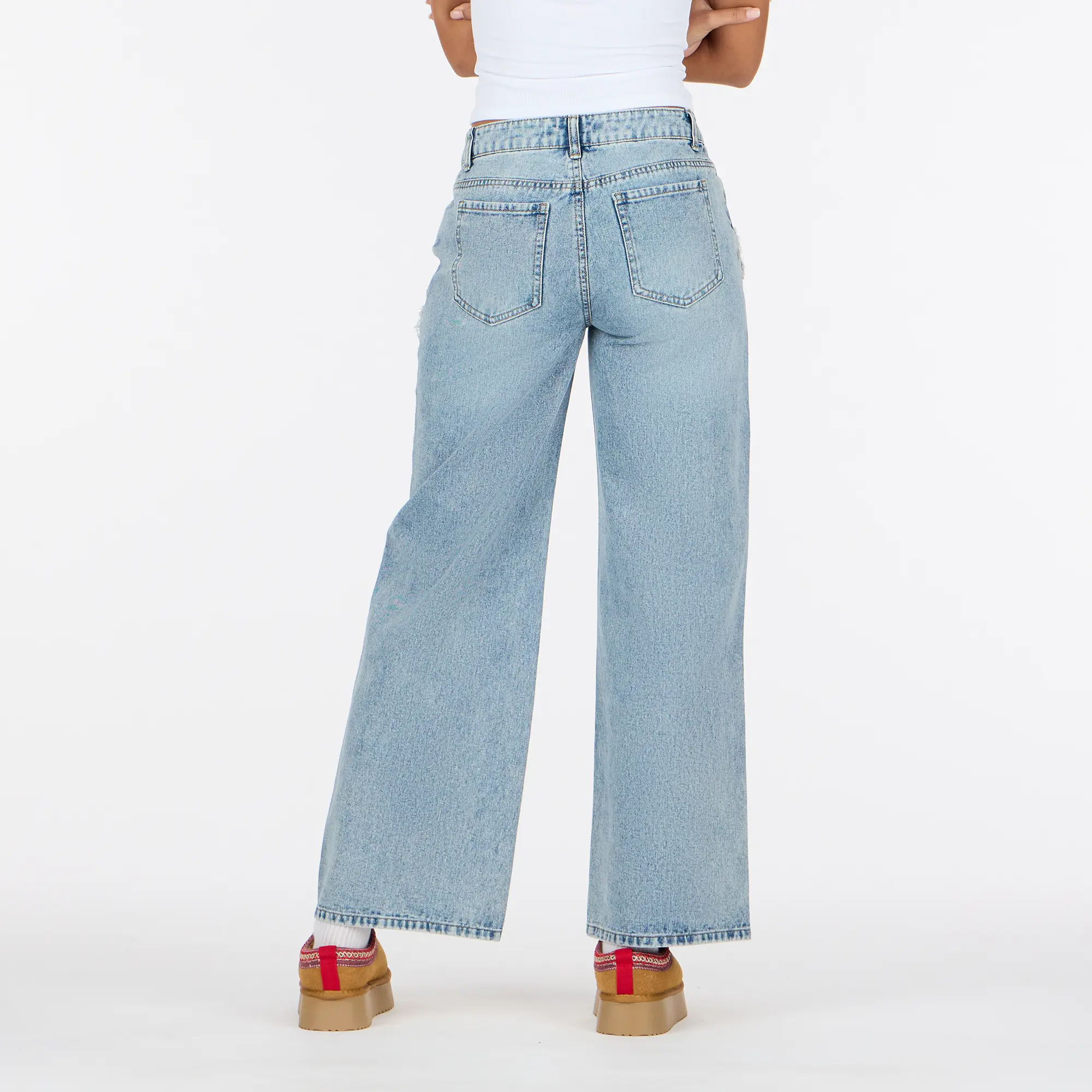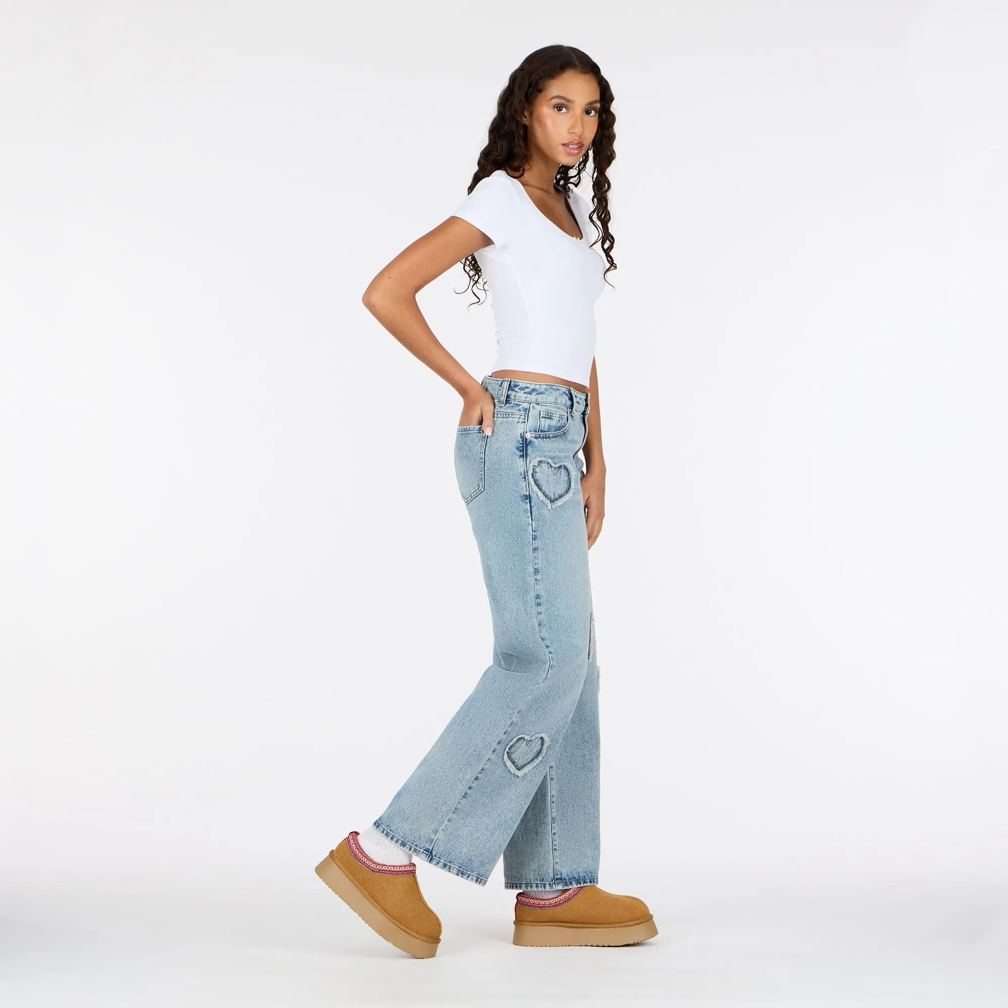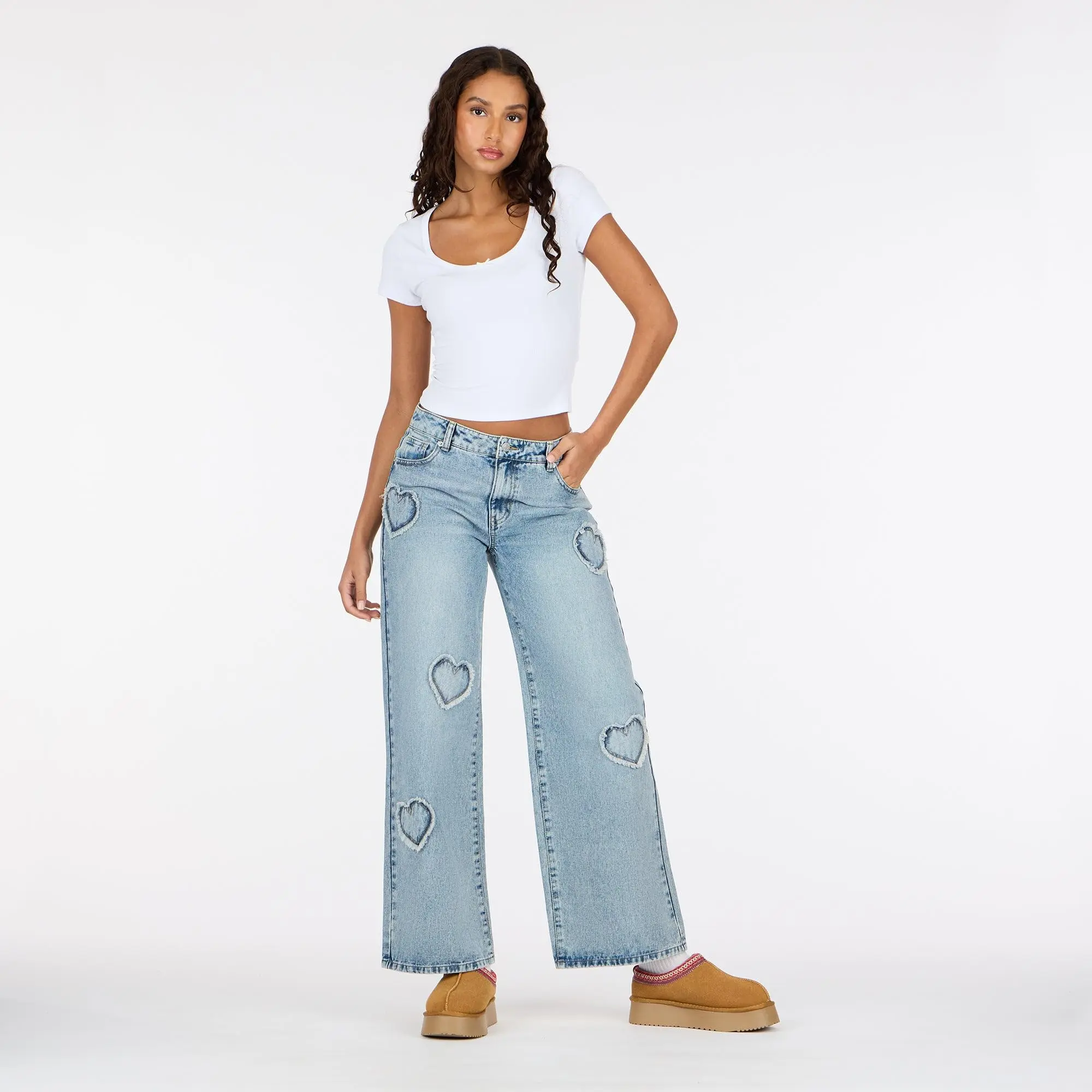 Add a playful touch to your everyday denim with these low waist wide leg jeans from Forever 21. Designed in a classic light wash, this pair features embroidered heart patch details throughout for a fun, feminine look. The relaxed wide leg silhouette offers all-day comfort, while the low-rise waist gives a trendy, laid-back vibe. Finished with a button-and-zip closure and classic five-pocket styling, these jeans are perfect for pairing with cropped tops, tanks, or casual knits for an effortlessly cute outfit.