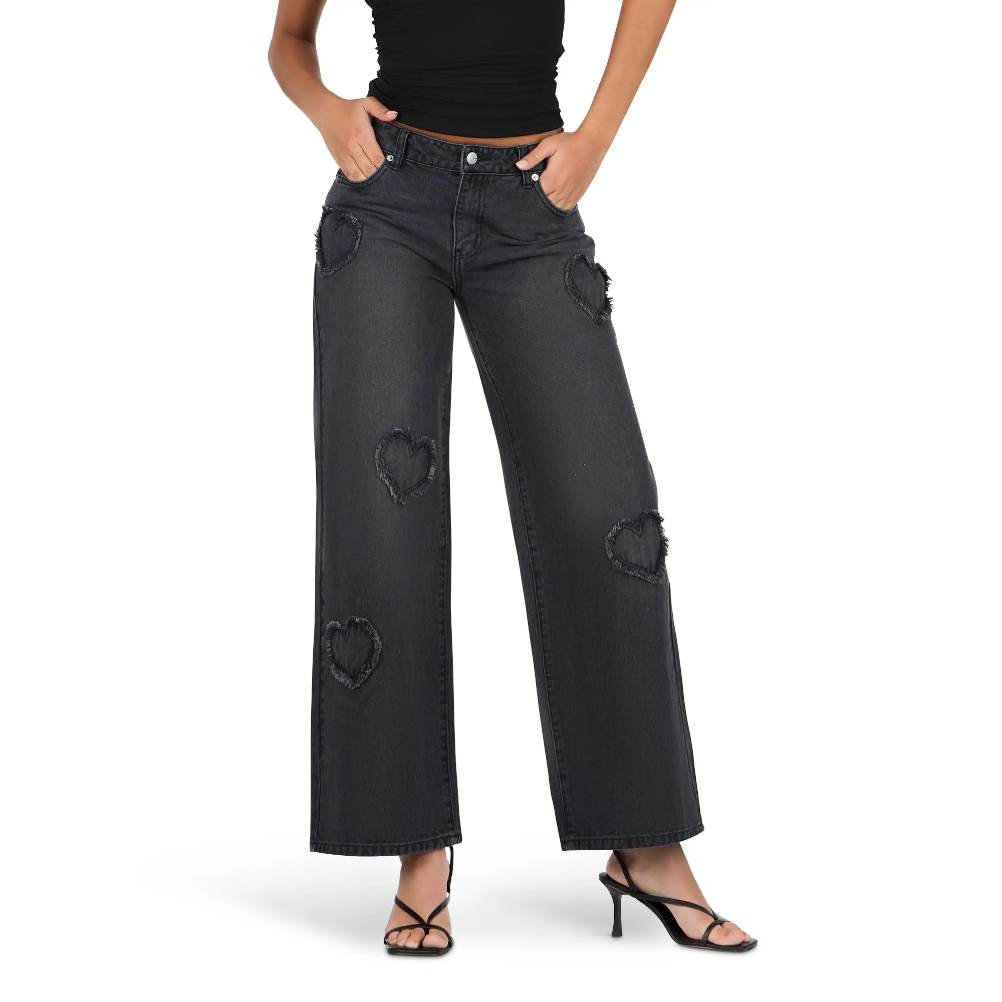 5. Forever 21 Women’s Low Waist Wide Leg Denim Jeans with Heart Patch Details
