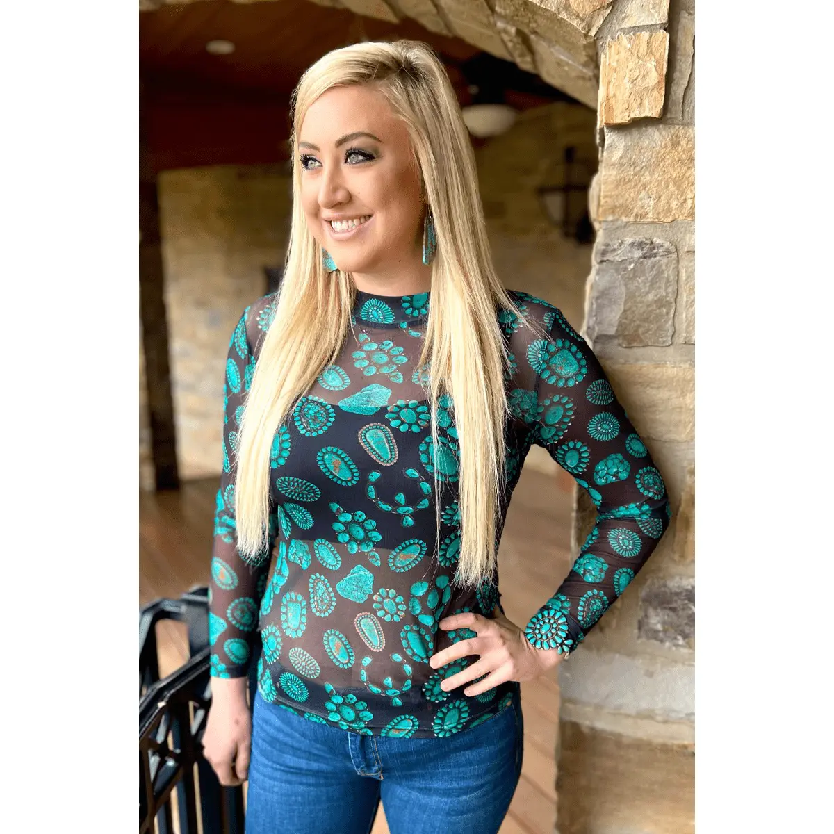 Be adventurous in the Forever in Turquoise Top! Its stretch thin mesh fabric and turquoise conchos create a look that's both daring and stylish. Take on any challenge confidently in this statement piece!