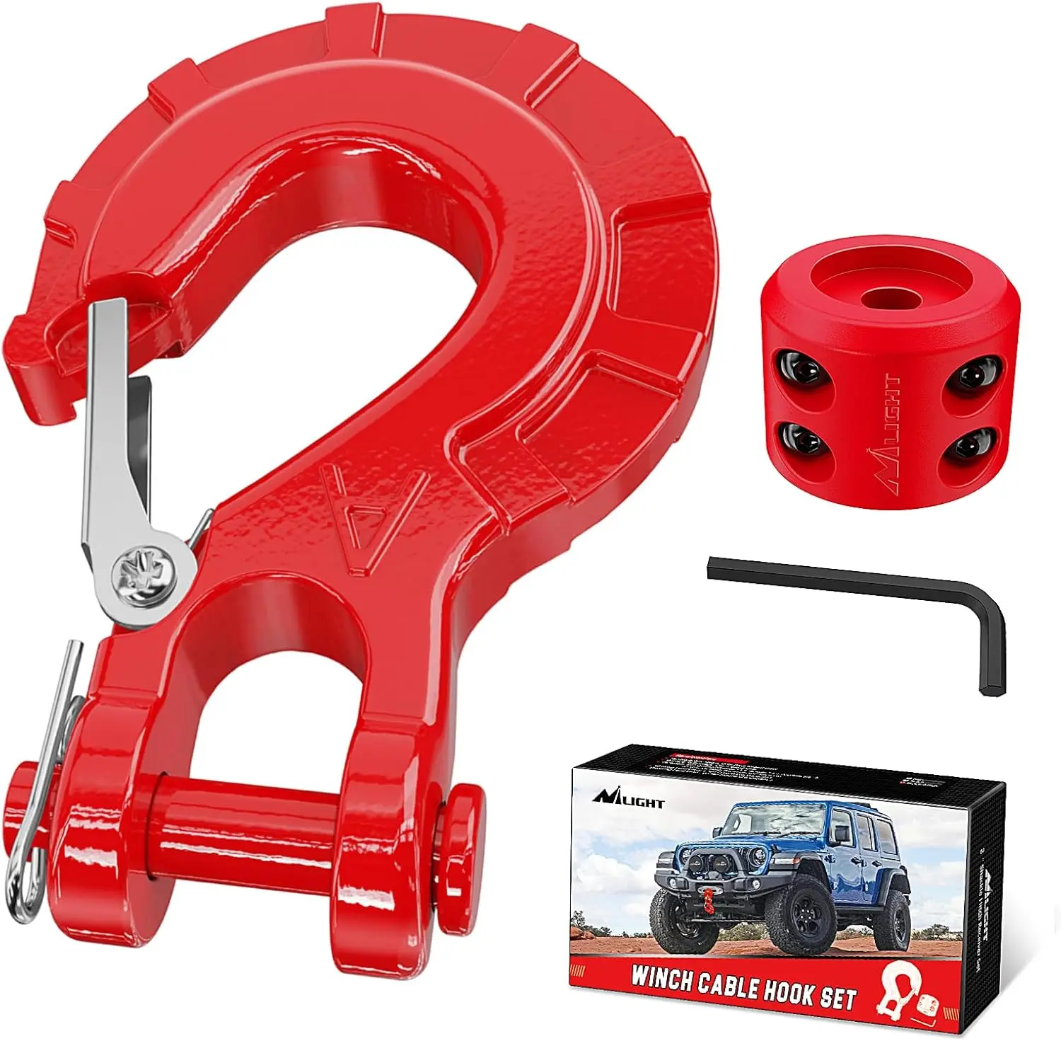 ·【EAST TO INSTALL】-The Winch Hook Has a Spring Loaded Safety Latch to Help Ensure a Secure Connection, Secured with a 1/2" Diameter Clevis Pin. the Winch Cable Hook Stop is a Two-piece Silicone Rubber Design with 4 Strong Carbon Steel Bolts, 4 Lock nuts and 4 Washers, with the Addition of a Portable Allen Wrench Tool and a Split Design for Easy Installation.