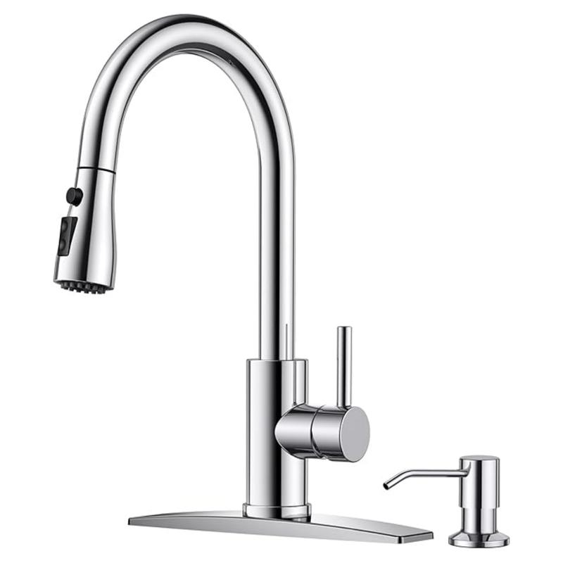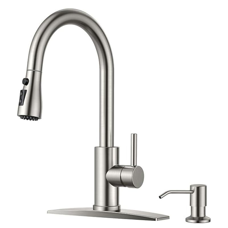 The FORIOUS high arc kitchen faucet with pull-down sprayer has 3 spray modes - Stream, Spray and Pause modes —for versatile use. It includes a 360° rotating head and an 18-inch retractable hose for complete sink coverage
