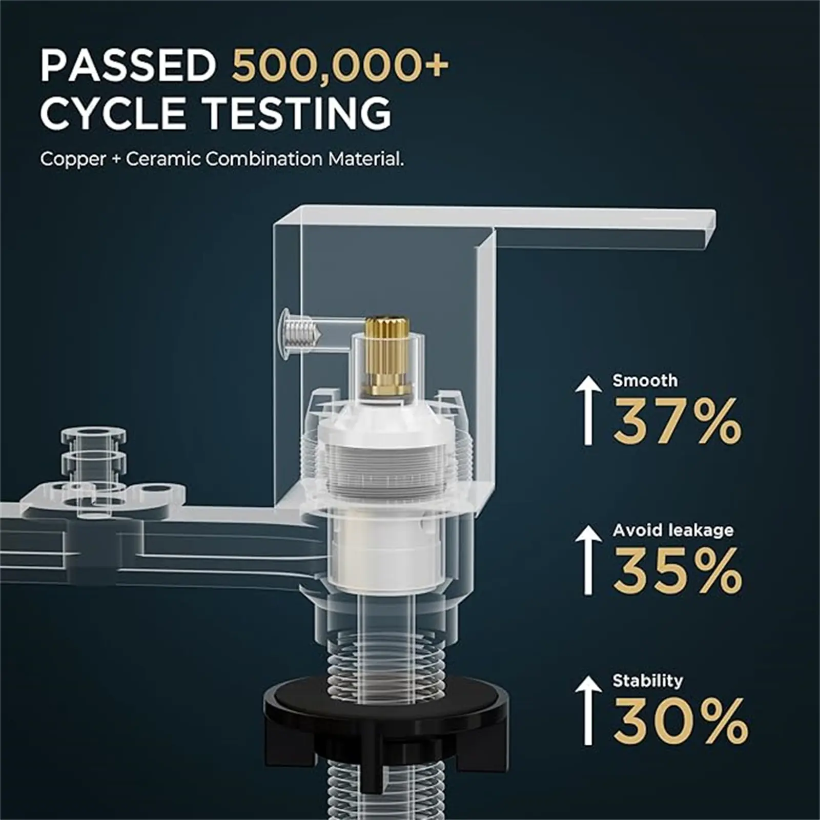 Equipped with a drip-free copper and ceramic disc cartridge, this faucet has passed a 500,000 cycle water tightness test, ensuring stability in various conditions, including extreme temperatures and hard water.
