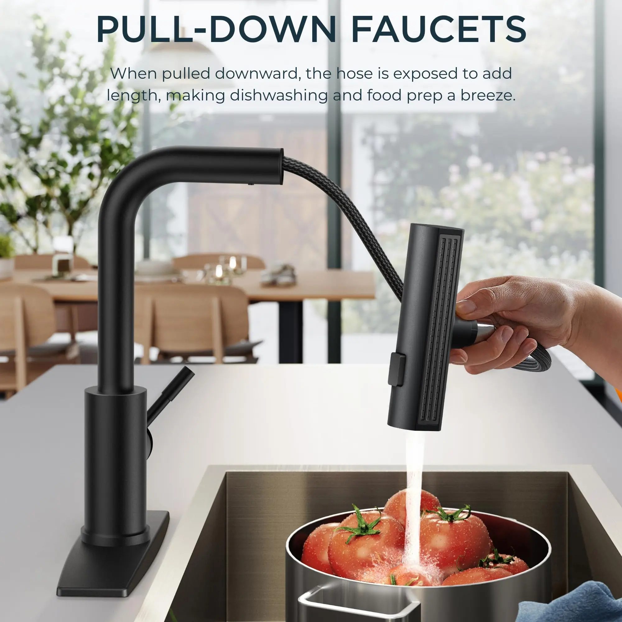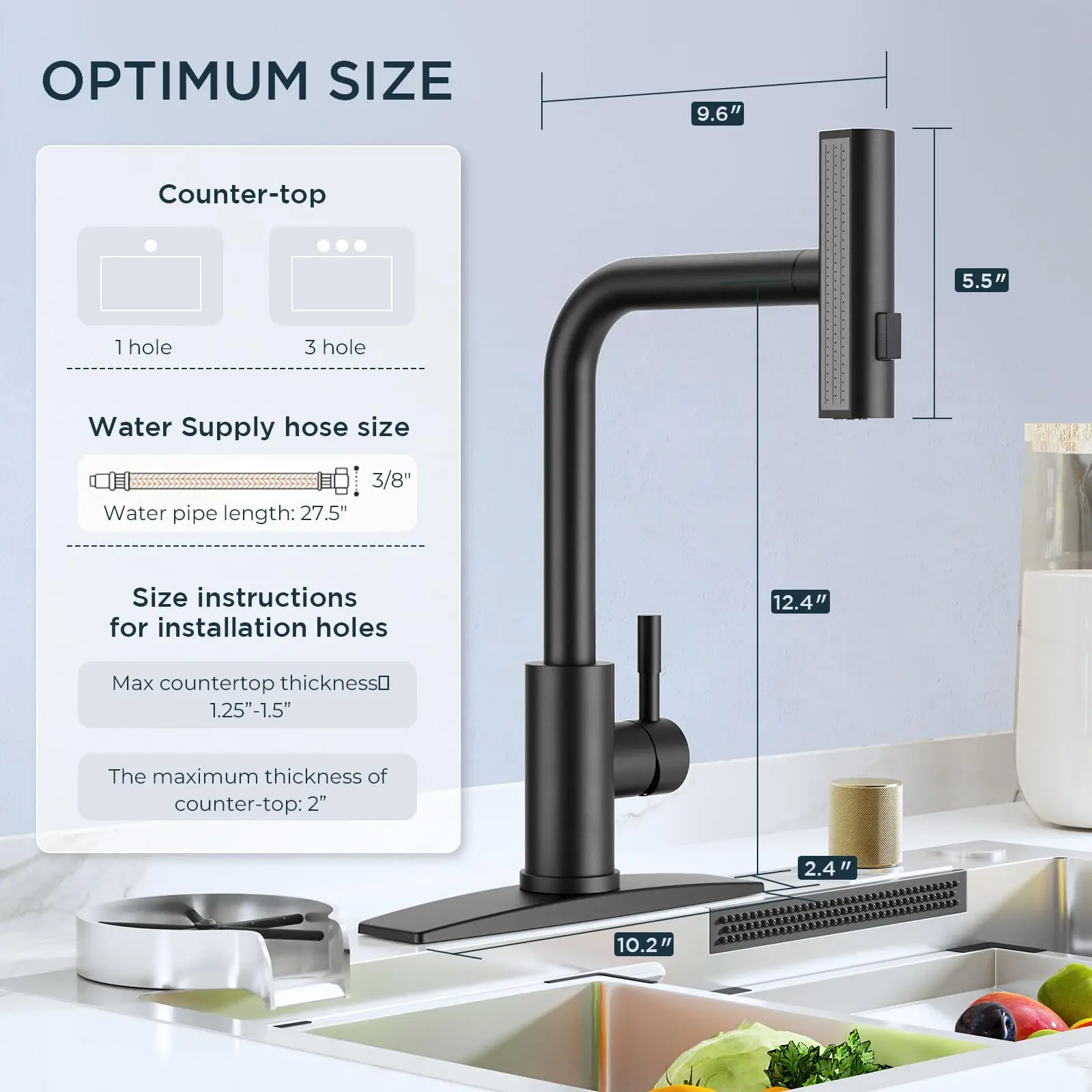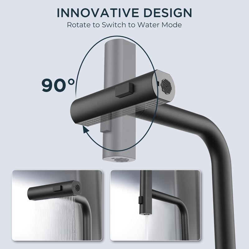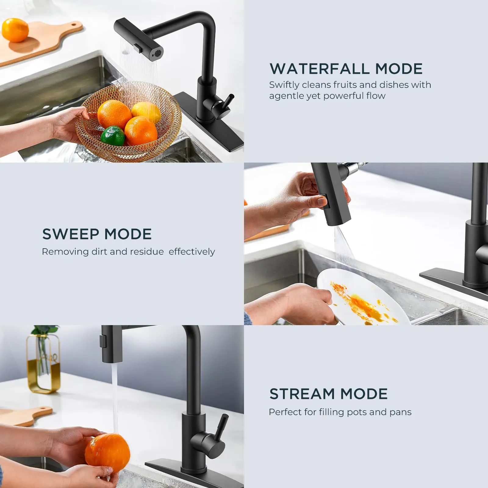 ·【New Function Mode】Our FORIOUS kitchen faucet now features three function modes: Waterfall, Sweep, and Stream. Stream is perfect for filling containers without sputtering, Sweep is ideal for efficient dishwashing, and Waterfall gently cleans large areas. The 90° rotating spout flexibly switches between modes.