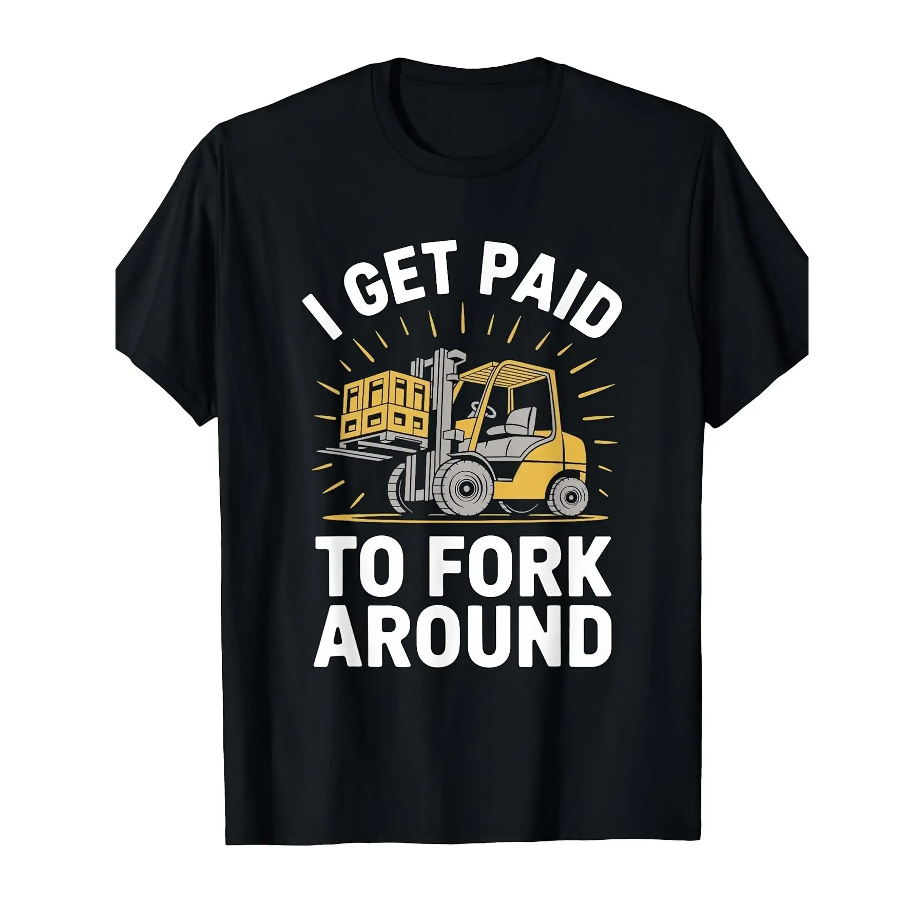 Unisex Heavy Industry Graphic T-Shirt - Forklift Truck Driver "I Get Paid to Fork Around" Print, Black with Yellow Forklift Design, Soft Breathable Cotton, Men's Industrial Workwear Tee for Warehouse, Construction