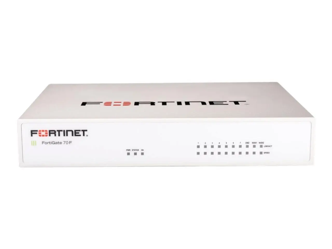 ·The FortiGate 70F series provides a fast and secure Next-Generation Firewall and SD-WAN solution in a compact fanless desktop form factor for enterprise branch offices and mid-sized businesses. Protects against cyber threats with system-on-a-chip acceleration and industry-leading secure SDWAN in a simple, affordable, and easy to deploy solution. Fortinets Security-Driven Networking approach provides tight integration of the network to the new generation of security.SecurityIdentifies thousands of applications inside network traffic for deep inspection and granular policy enforcementProtects against malware, exploits, and malicious websites in both encrypted and non-encrypted trafficPrevent and detect against known and unknown attacks using continuous threat intelligence from AI-powered FortiGuard Labs security servicesPerformanceDelivers industrys best threat protection performance and ultra-low latency using purpose-built security processor (SPU) technologyProvides industry-leading performance and protection for SSL encrypted trafficCertificationIndependently tested and validated for best-in-class security effectiveness and performanceNetworkingDelivers advanced networking capabilities that seamlessly integrate with advanced layer 7 security and virtual domains (VDOMs) to offer extensive deployment flexibility, multi-tenancy and effective utilization of resourcesDelivers high-density, flexible combination of various high-speed interfaces to enable best TCO for customers for data center and WAN deploymentsManagementIncludes a management console that is effective, simple to use, and provides comprehensive network automation and visibilityProvides Zero Touch Integration with Fortinets Security Fabrics Single Pane of Glass ManagementPredefined compliance checklist analyzes the deployment and highlights best practices to improve overall security postureSecurity FabricEnables Fortinet and Fabric-ready partners products to provide broader visibility, integrated end-to-end detection, threat intelligence sharing, and automated remediation