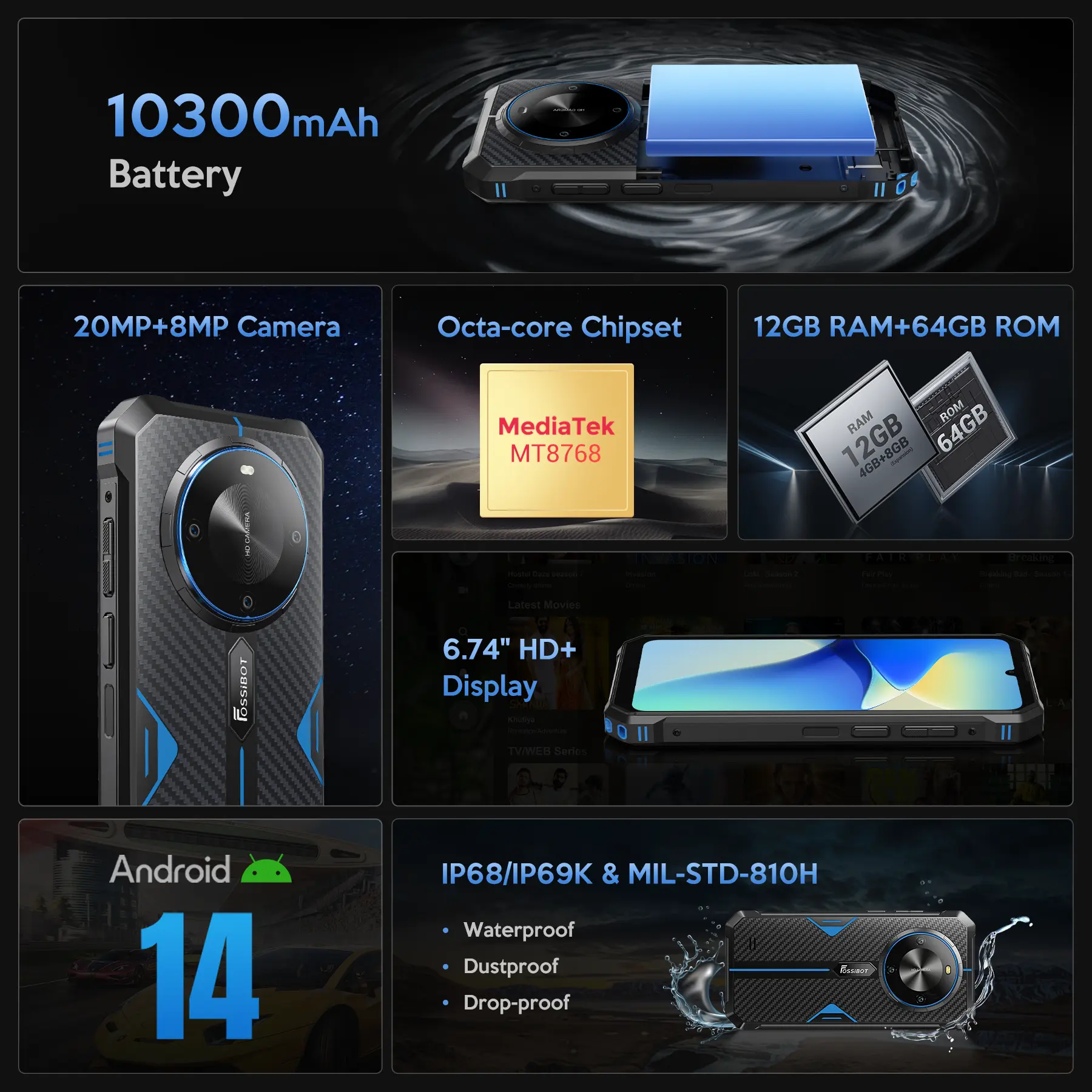 ·MT8768 Octa-Core Processor & 12GB RAM + 64GB/1TB ROM: FOSSIBOT F105 rugged smartphone uses an octa-core MediaTek MT8768 12nm chip offers the perfect balance between powerful performance and efficiency. 12GB RAM (4GB RAM + 8GB virtual RAM) can handle multiple tasks simultaneously for faster application switching without any lag. The 64GB of the FOSSIBOT F105 Android phone can be expanded to 1TB, which can store more content ,storage without worrying about insufficient space.