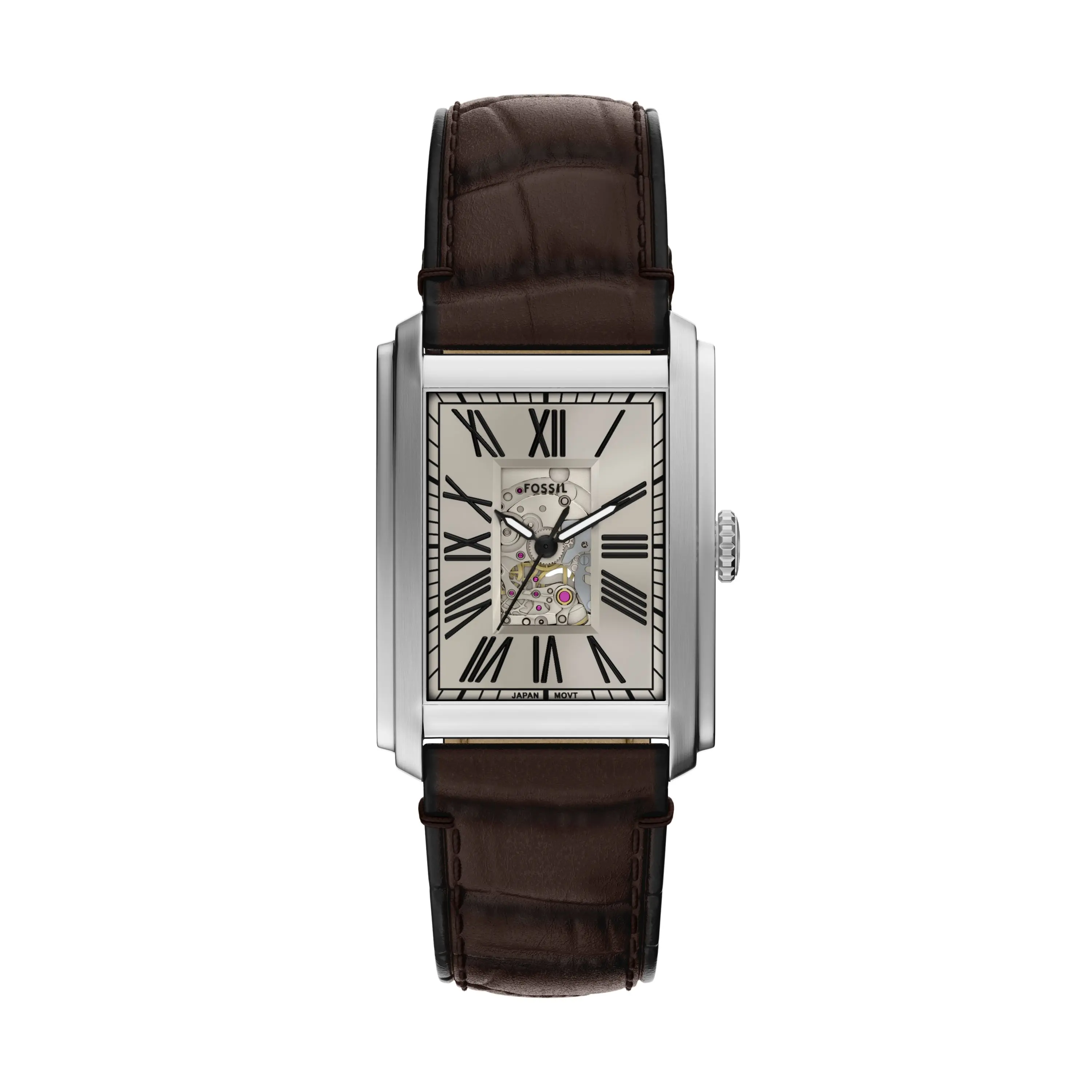 An instant classic, Carraway is thoughtfully designed down to every last detail. The automatic movement is visible through the open caseback and skeletonized dial, adding a design-focused, functional detail. With a classic eggshell dial, curved-for-your-wrist case, and a brown croco-embossed leather strap with soft nubuck lining, it's as timeless as it is comfortable.