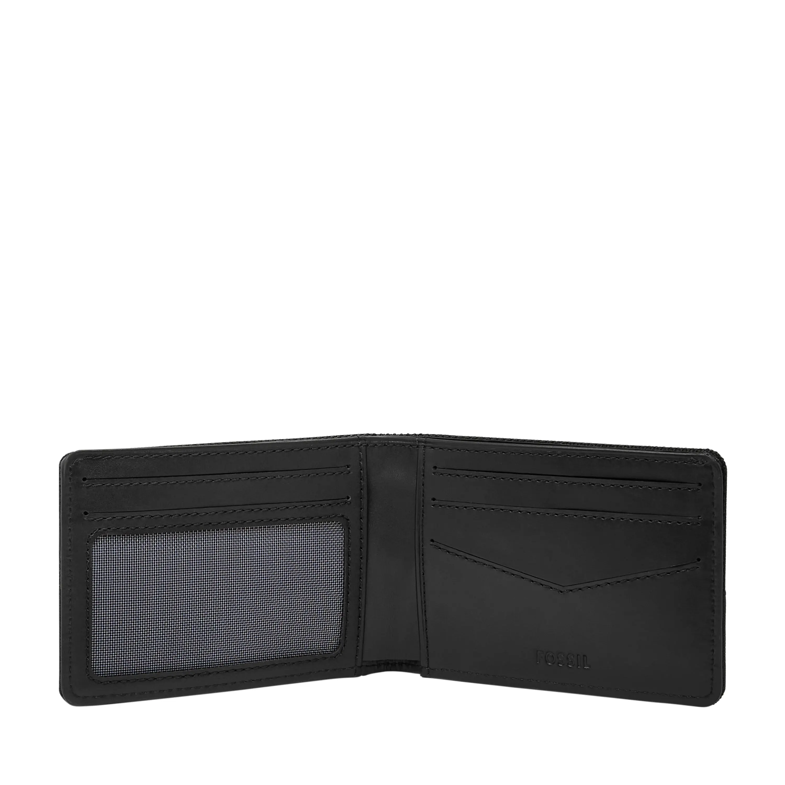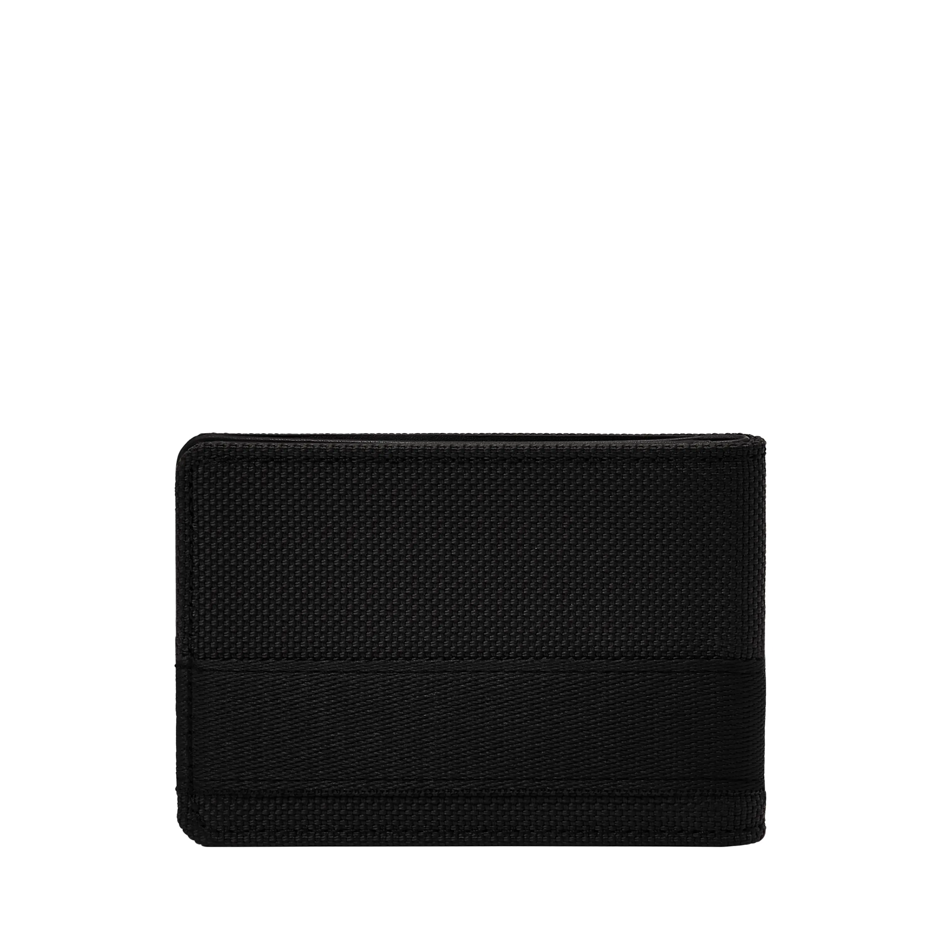 This pocket bifold is a sleek, modern essential. Crafted from durable black water-resistant nylon with polyester trim, its minimalist design includes an ID window, bill compartment, and multiple card slots for effortless organization. Slip it into your front pocket for a streamlined, sophisticated look. Fossil leather products support responsible manufacturing via the Leather Working Group.