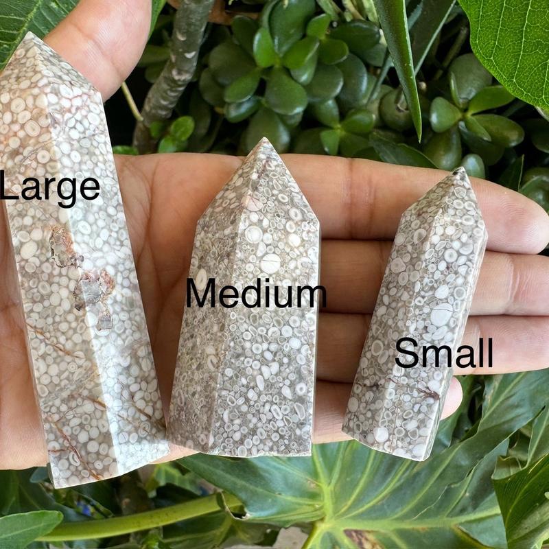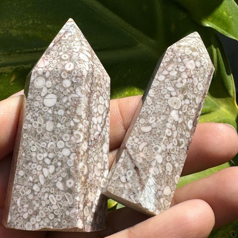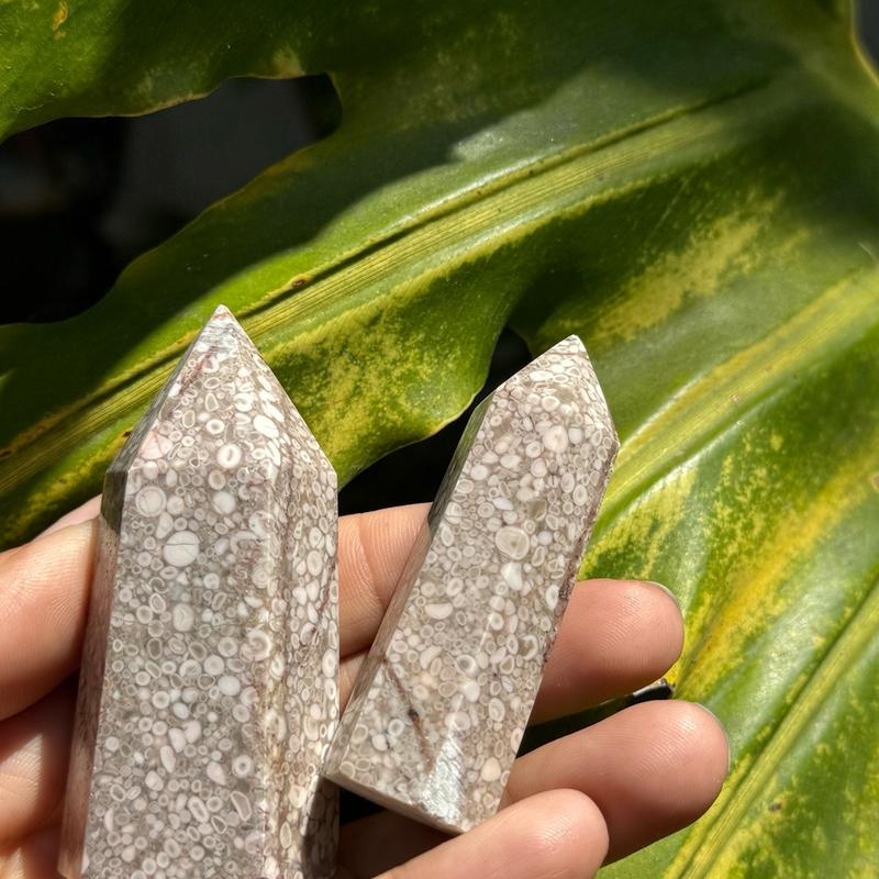 Beautiful Fossilized Coral Jasper Stone Towers • Available from Urban Rutile • Fossil Coral Jasper helps with self-expression and speech by removing fears, anxiety, and emotional blockages. It improves one's self-esteem and confidence through right speech and actions. It is an excellent stone to aid transition as it banishes negative patterns like procrastination.