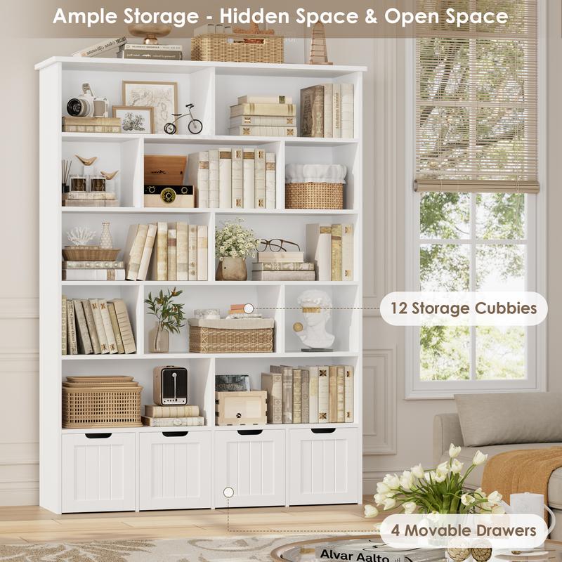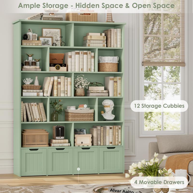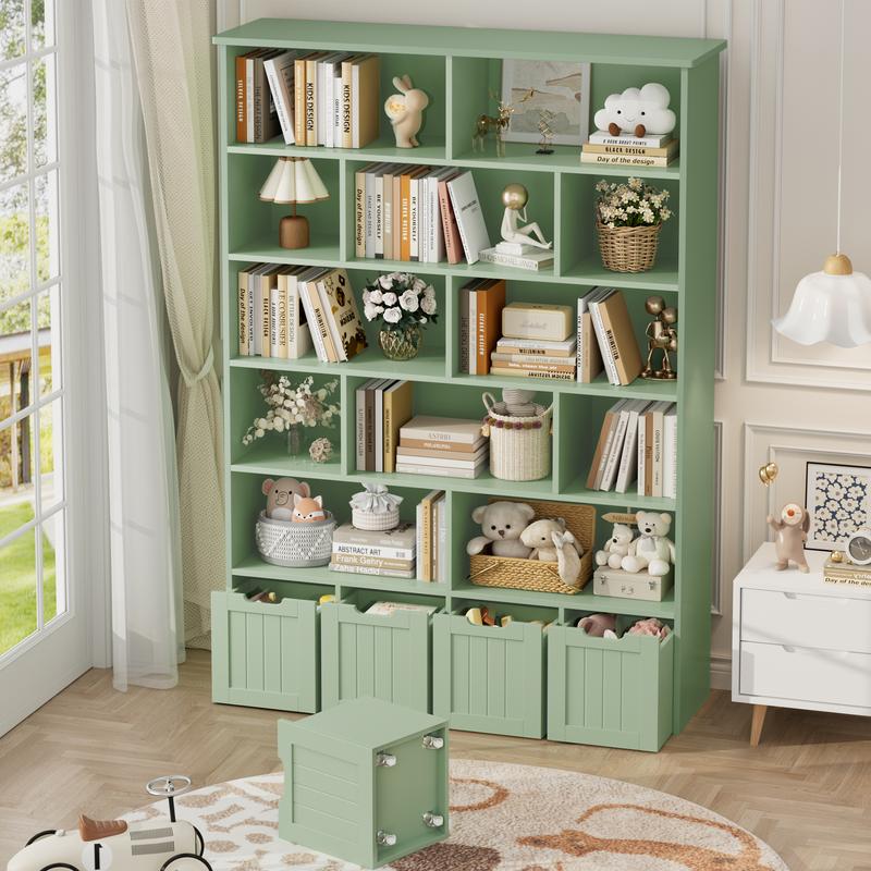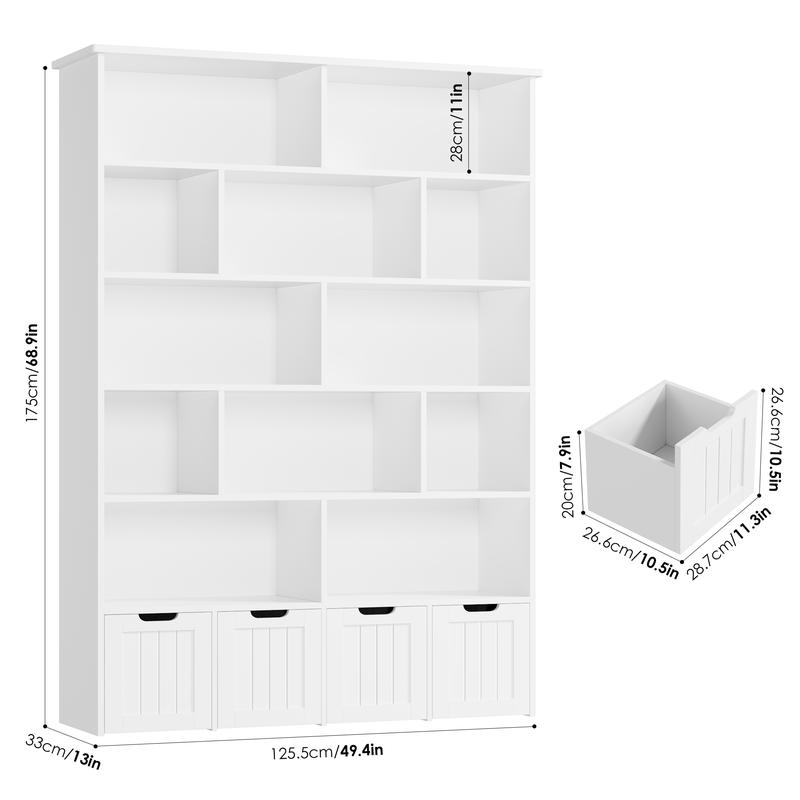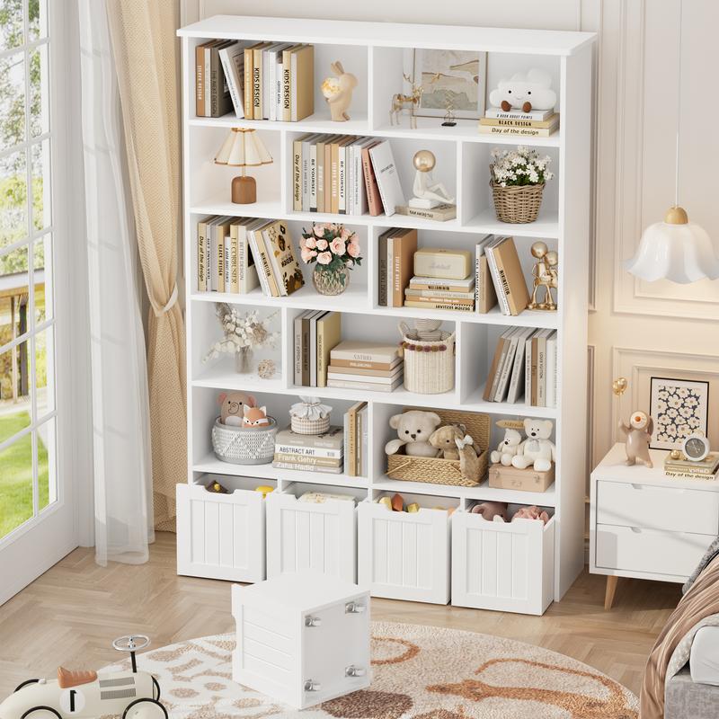 Ā·ćAmple Storage for Various NeedsćThe spacious tabletop can place a clock or nightlight, 12 storage cubes make it easy to grab off favorite books, while offering tons of ample open storage space. 4 Deep drawers with wheels allow you to tuck away games, puzzles, etc. The book storage organizer with 4 drawers is an ideal choice for small rooms that require storage.