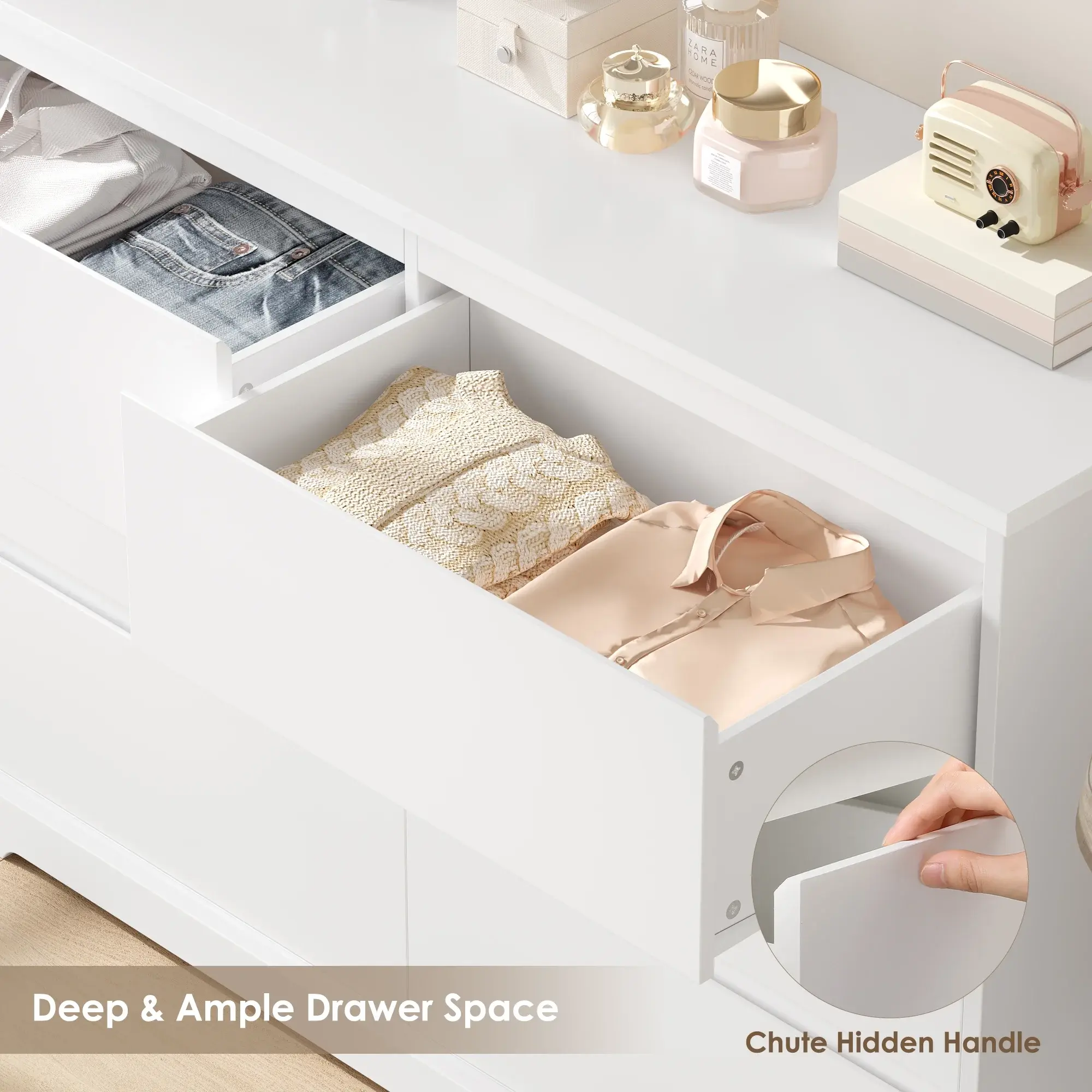 All-matched style: The storage drawer uses a classic white body with smooth lines and no handle, looking elegant and charming to fit any home style.
