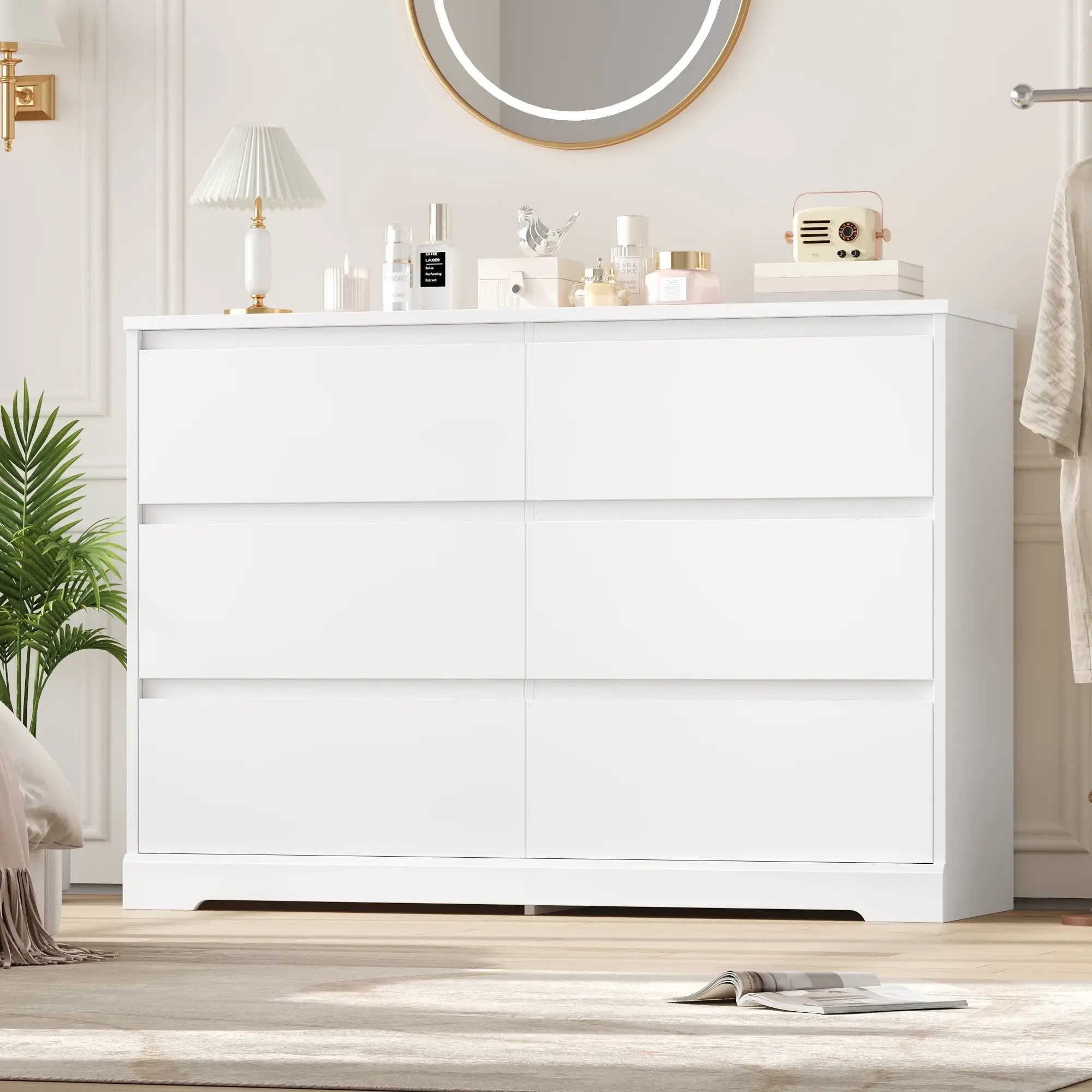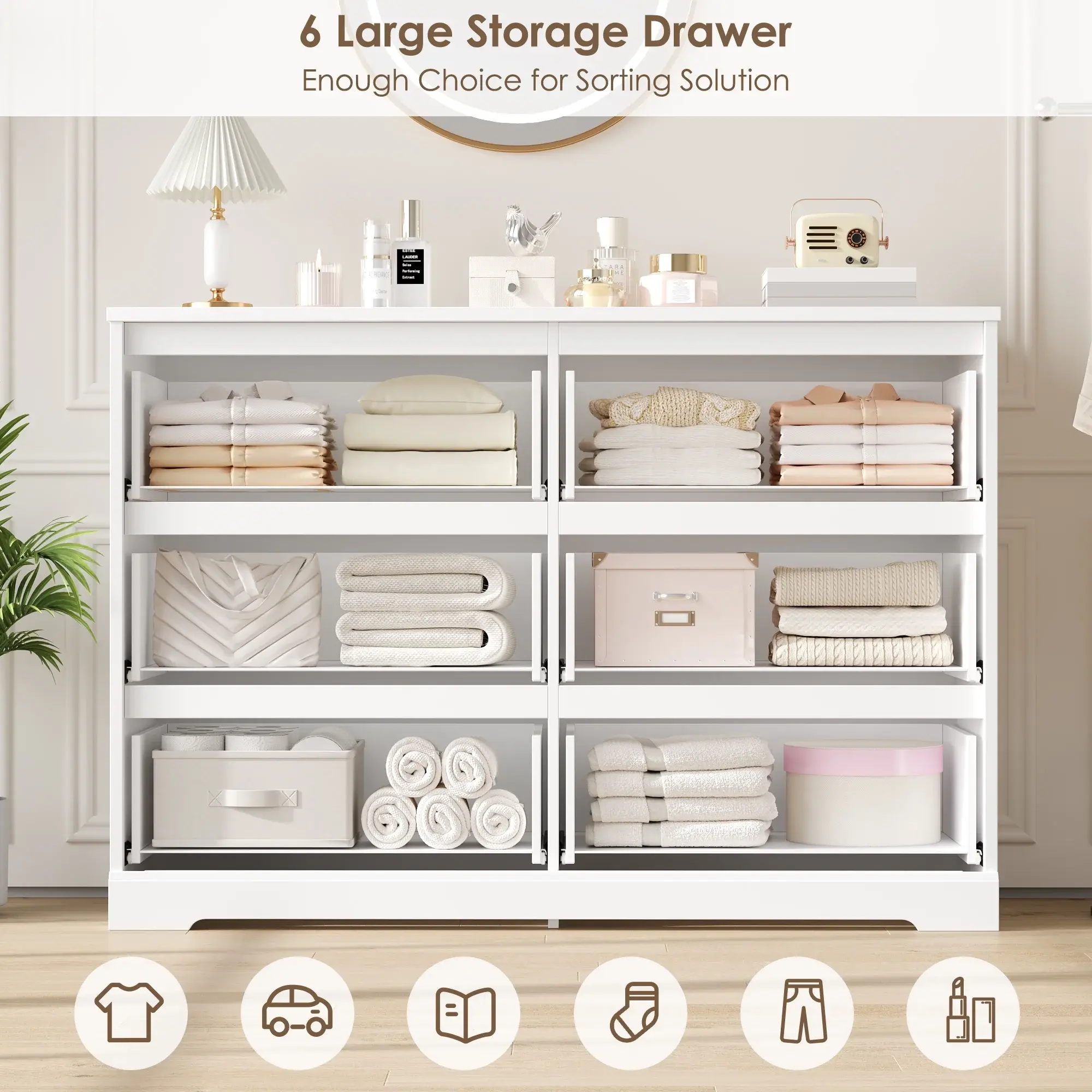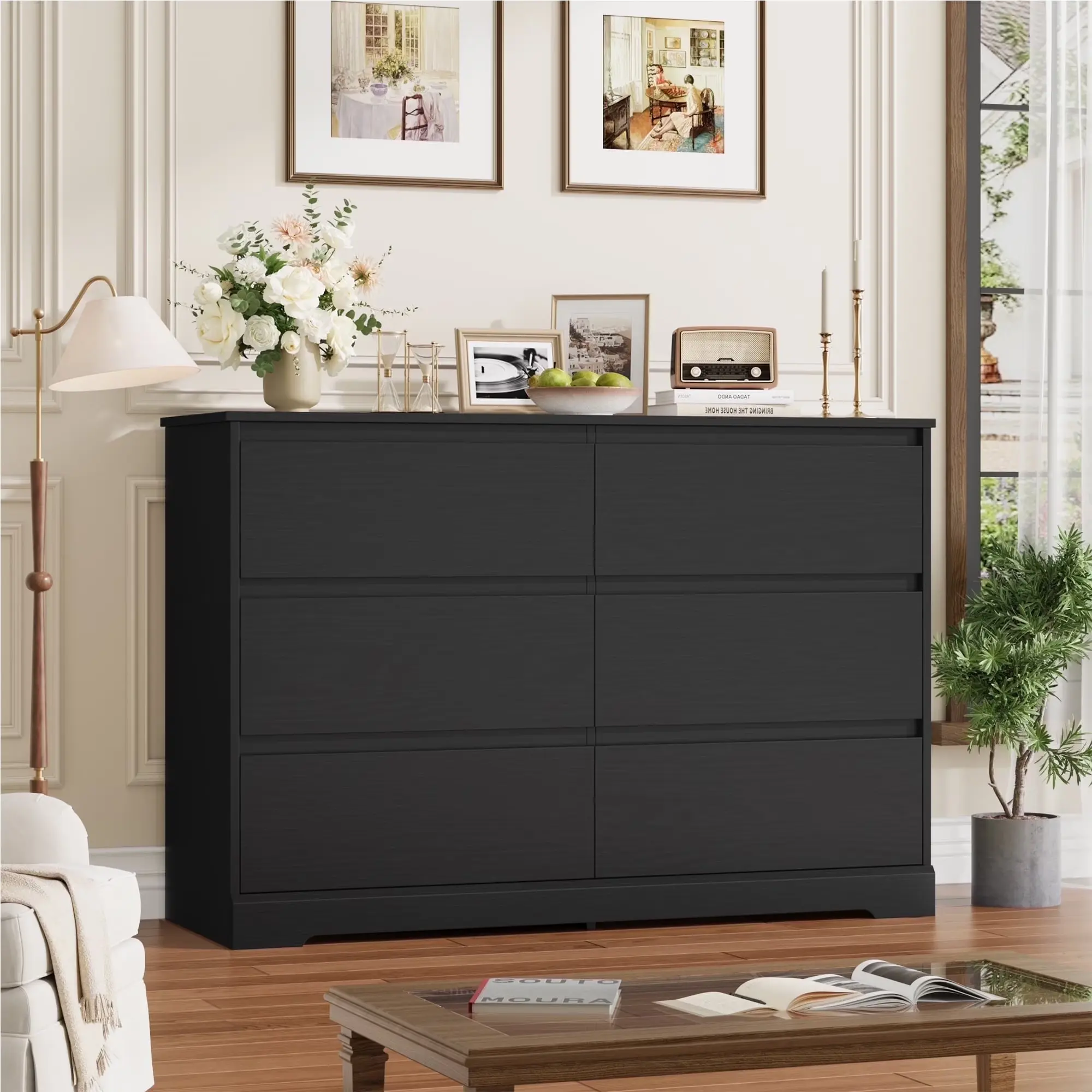 Multi-use: This 6-drawer double dresser is beautiful and practical, its streamlined design makes this piece blend with decor styles from minimal to contemporary which is suitable for all areas such as the entrance, living room, and kid's room.