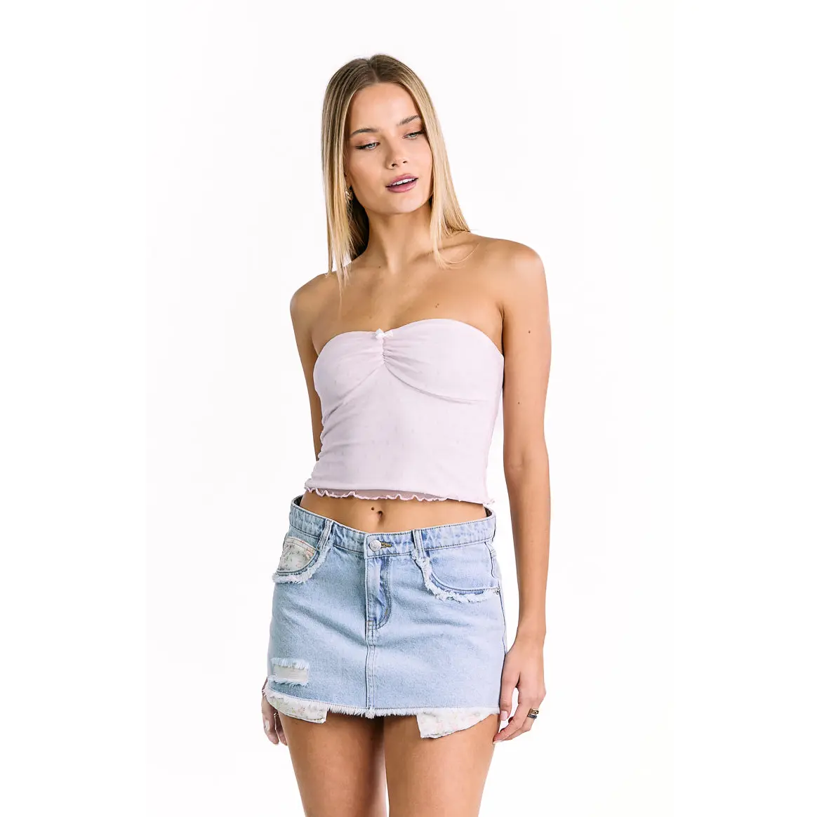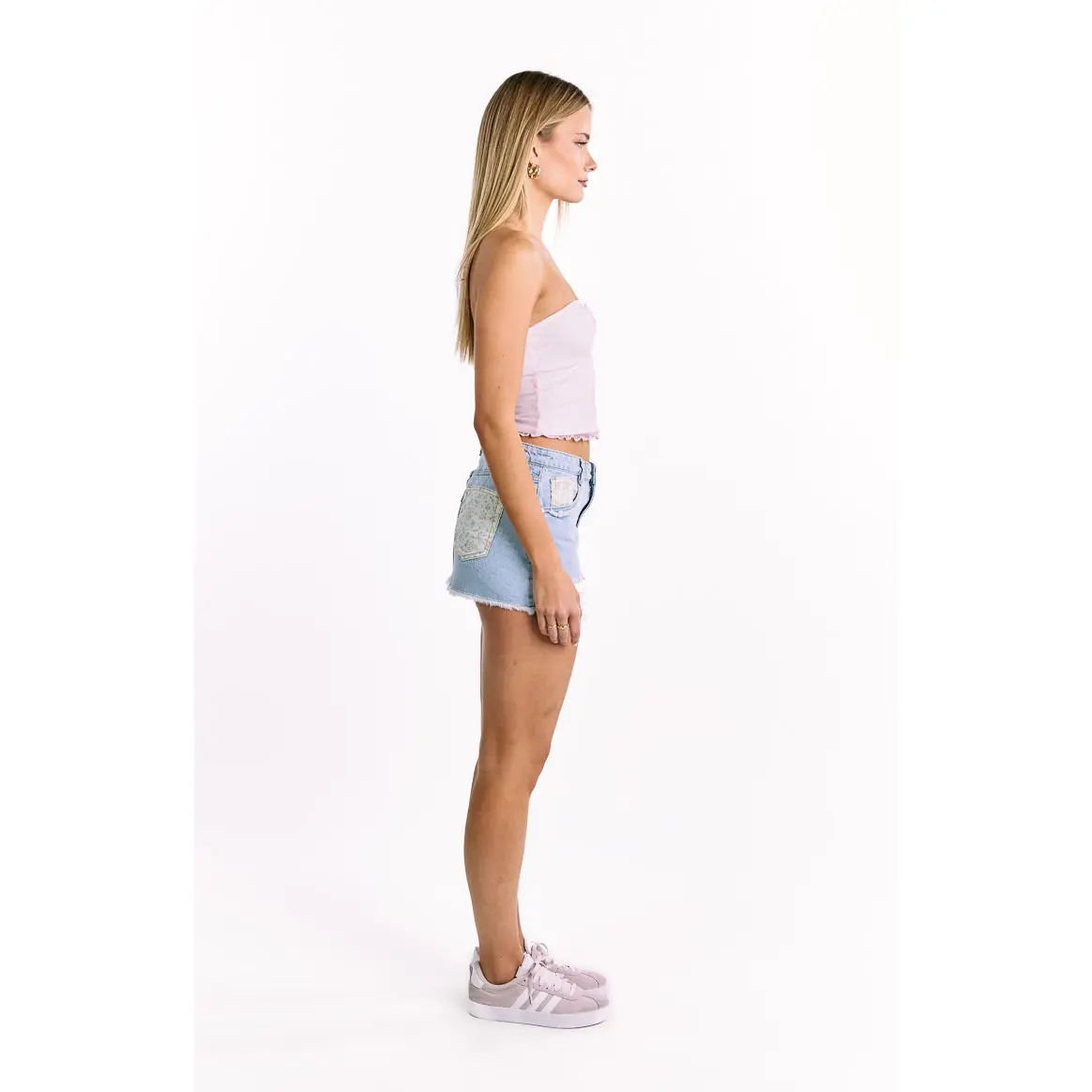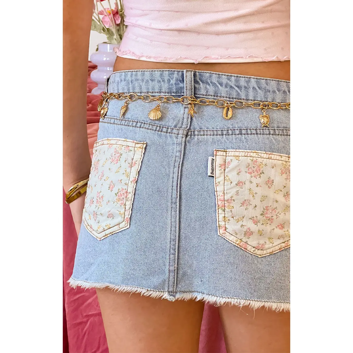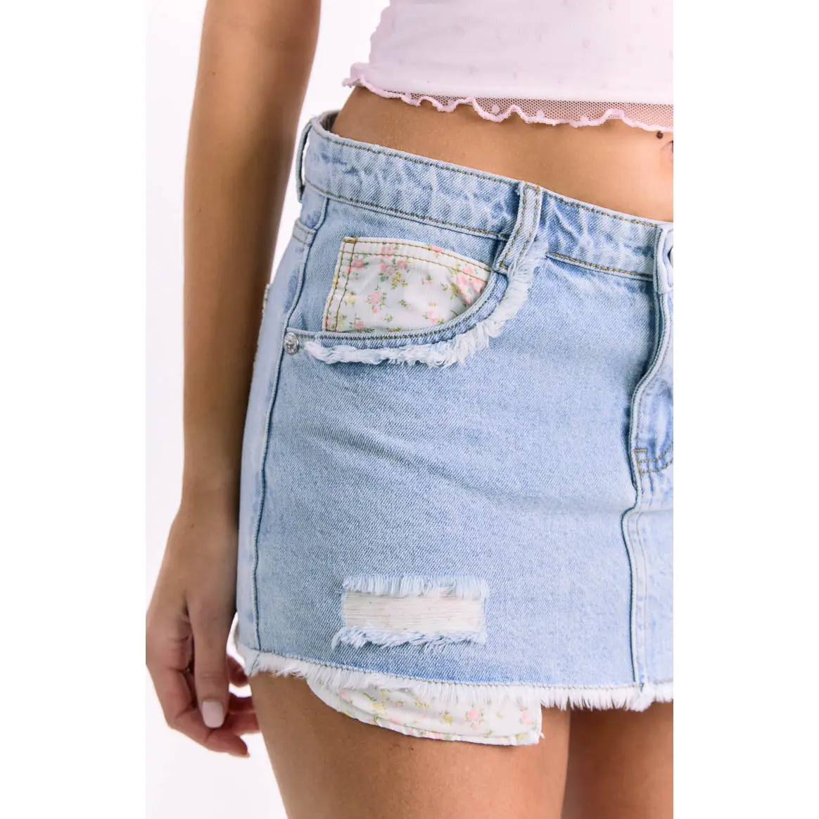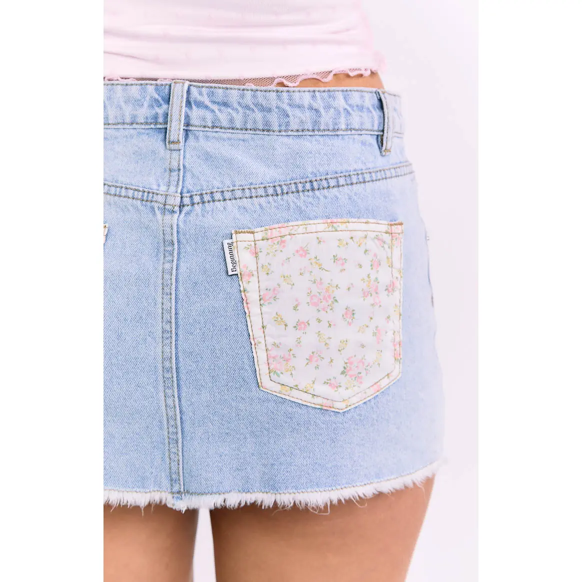 How to Style: Ready to turn up the fun? Meet our Found Love Denim Skirt! This refresh on the classic denim mini features a light wash and playful floral contrast fabric details. For an effortlessly cool daytime look, style it with a simple baby tee and your favourite sneakers.